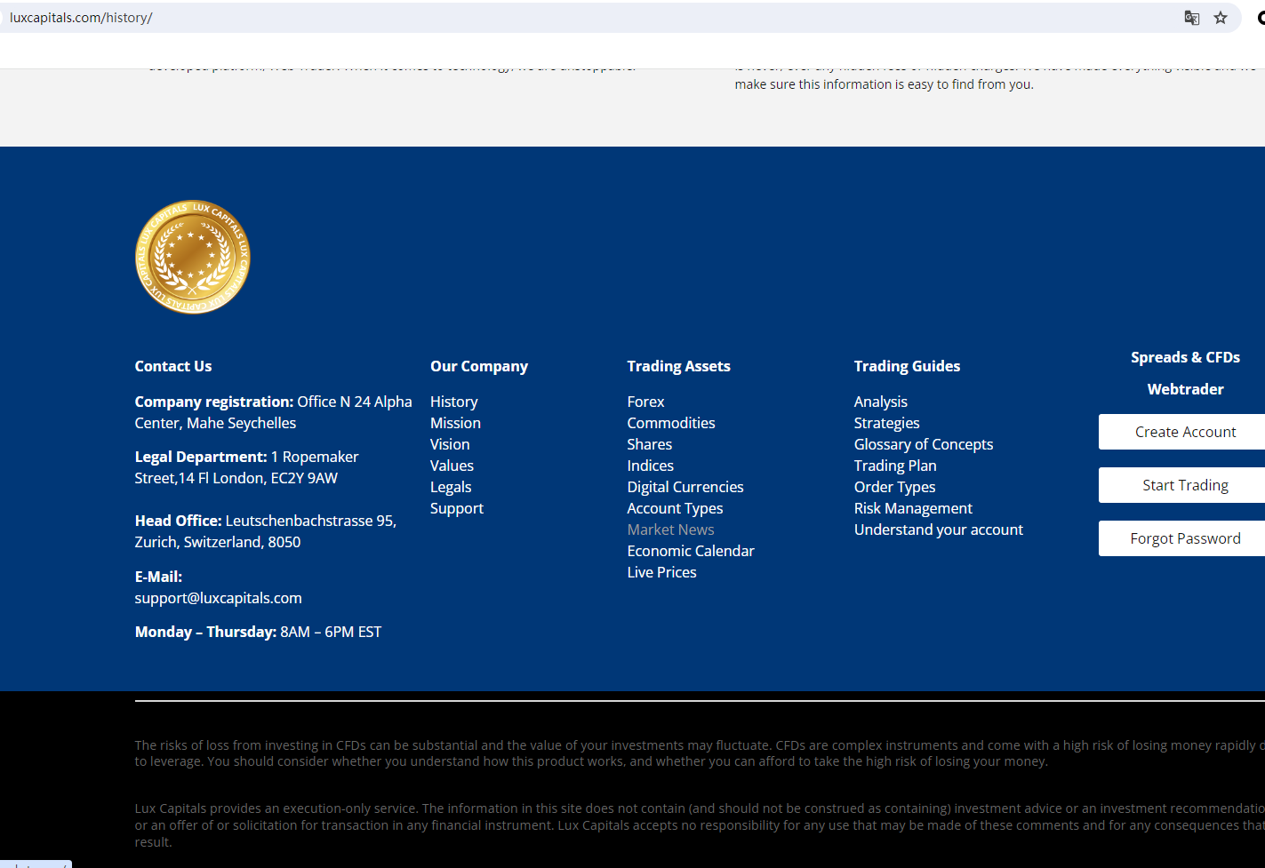 According to its website, it claims that the company is registered in the Seychelles and is headquartered in Switzerland, and the legal department is located in London. Upon investigation, no matching information was found in the Seychelles Financial Services Authority (FSA Seychelles), Swiss Financial Market Supervisory Authority (FINMA), and Financial Conduct Authority (FCA).In addition, the British Columbia Securities Commission (BCSC) issued a warning that Lux Capitals was providing financial services or products without authorisation.The truth is that Lux Capitals is not regulated by any regulators. Letting it hold or control investors' money is unsafe, and the money can not be protected by any laws.Lux Capitals is a scam.