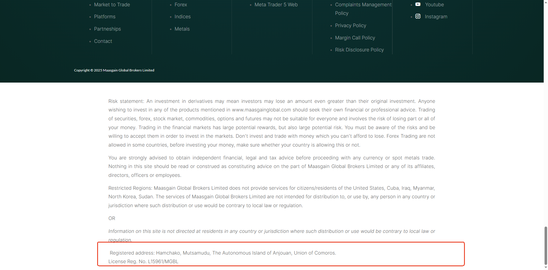 Maasgain Global Brokers claims to be regulated by the Anjouan Offshore Finance Authority (AOFA) in Comoros. However, the AOFA is an offshore regulatory body that is known for its weak oversight and lack of international recognition. The jurisdiction offers limited investor protection, and its regulatory framework is generally considered to be unreliable by global financial standards.