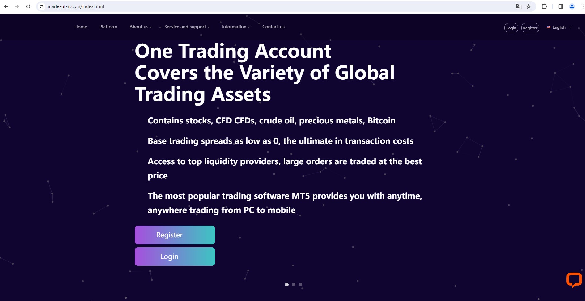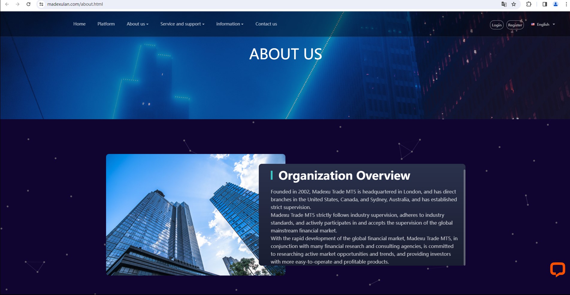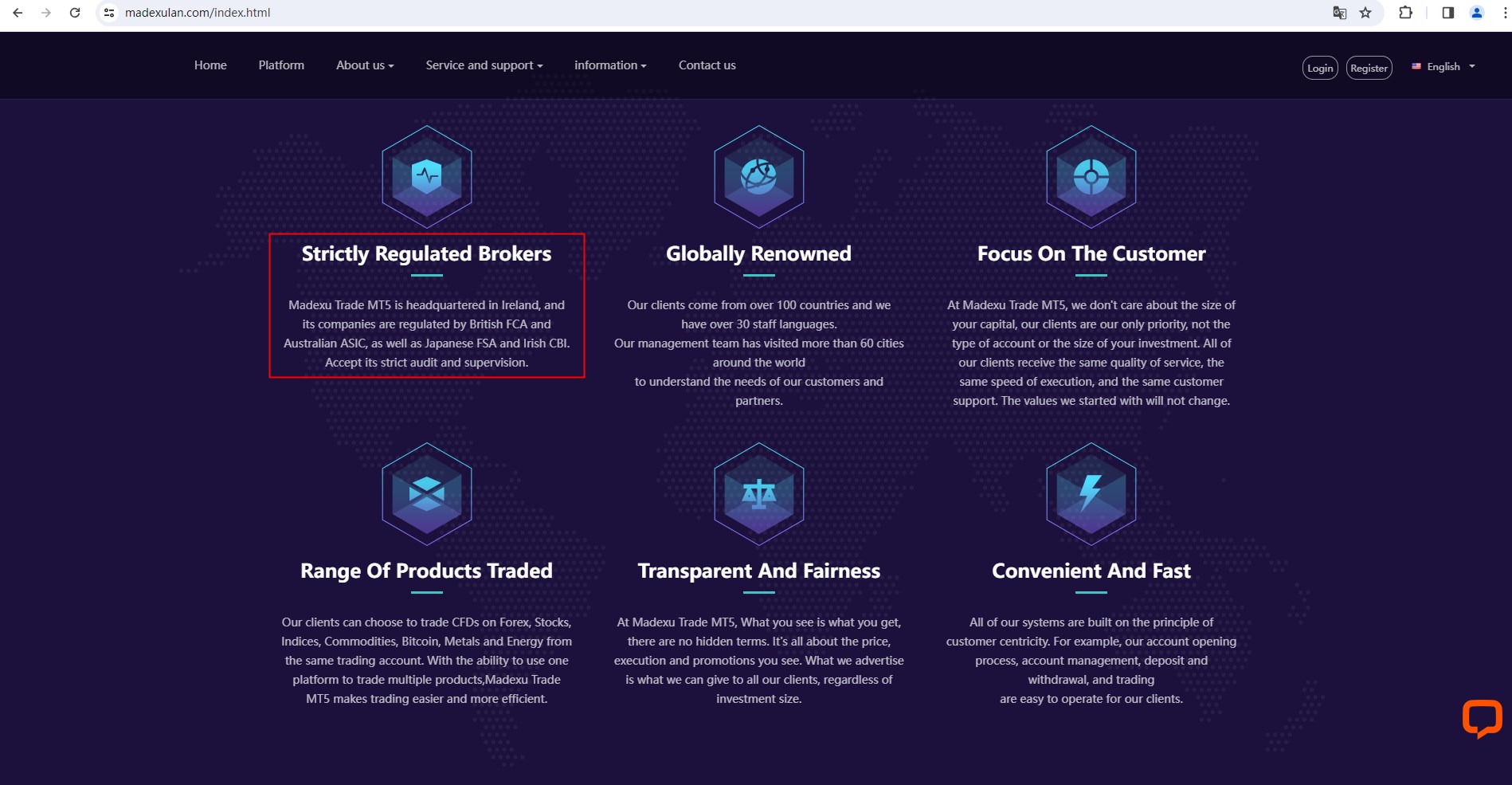Madexu Trade MT5 claims to be headquartered in the UK. It conducts CFD trading in Forex, stocks, indices, commodities, Bitcoin, metals and energy. It has direct branches in the United States, Canada and Australia, and is regulated by the Financial Conduct Authority (FCA), the Australian Securities and Investments Commission (ASIC), the Japan Financial Services Agency (Japan FSA), and the Central Bank of Ireland (CBI).
