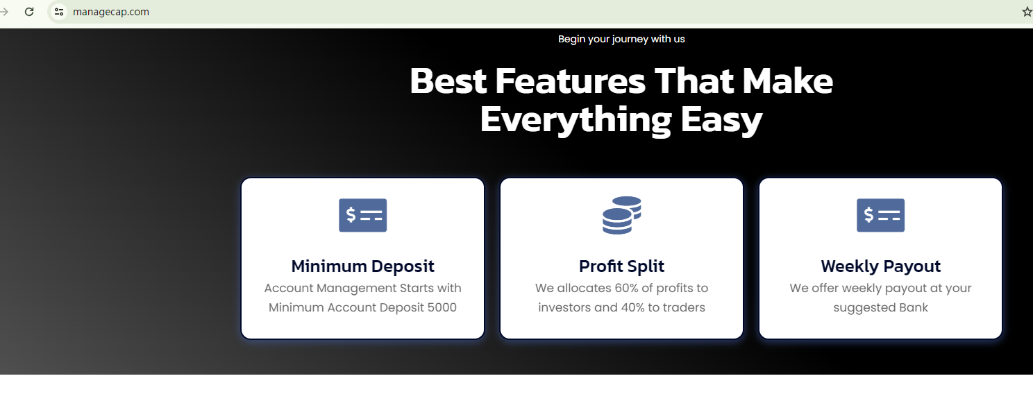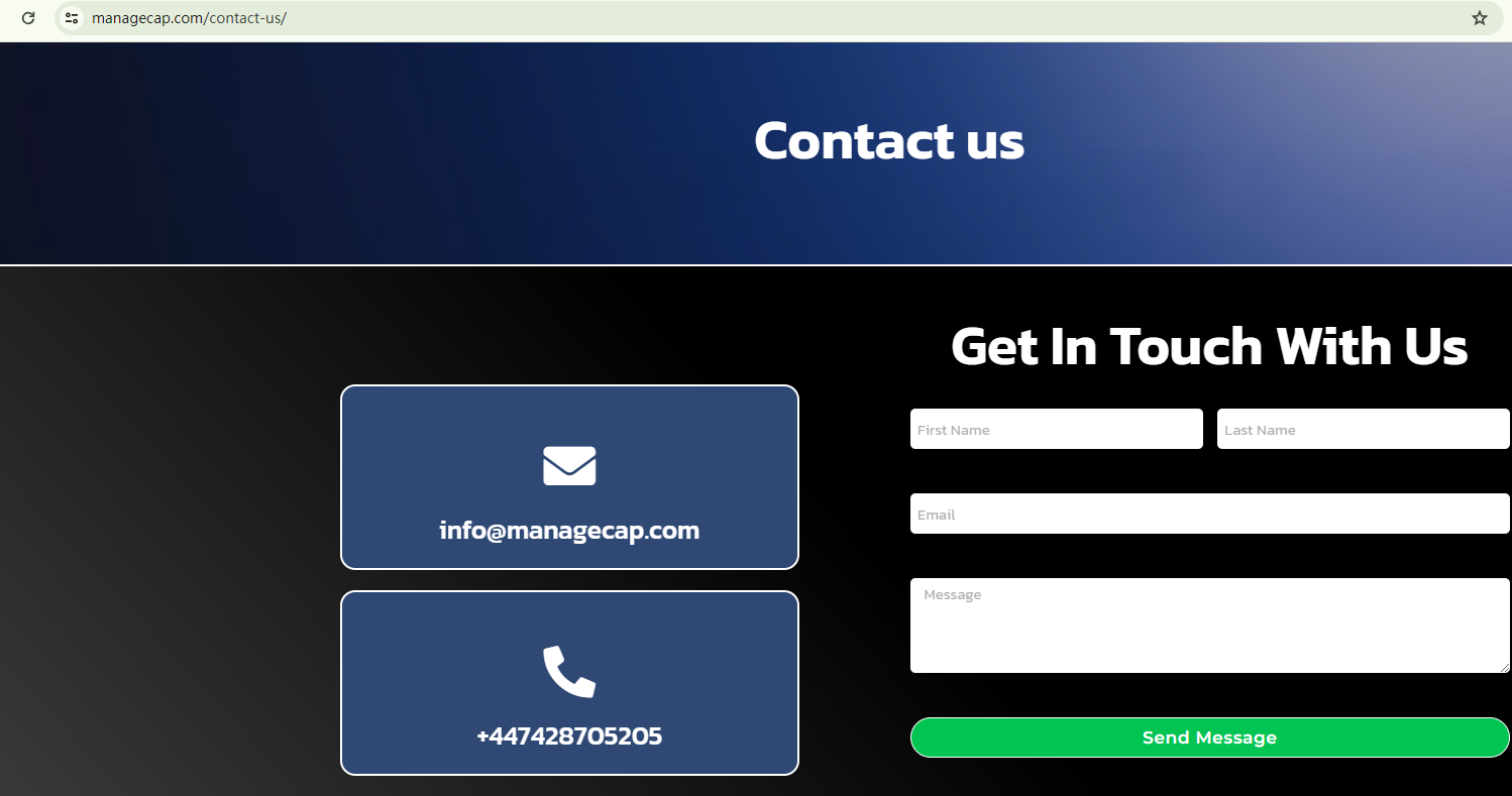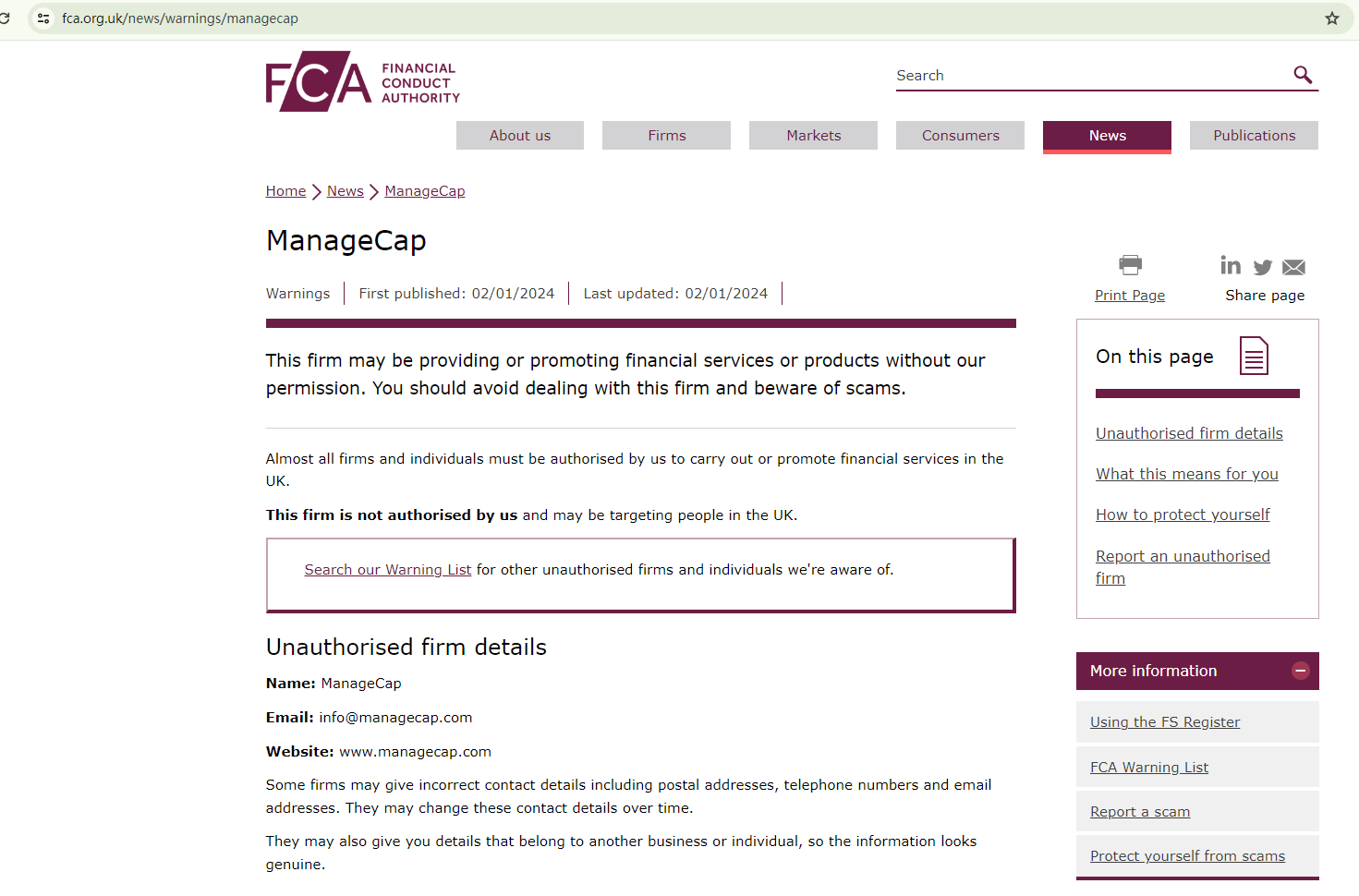 While it has a UK phone number, suggesting a possible office in the UK, it hasn't secured the required license from the Financial Conduct Authority (FCA). As such, the FCA issued a warning about ManageCap, identifying it as an unauthorized firm.