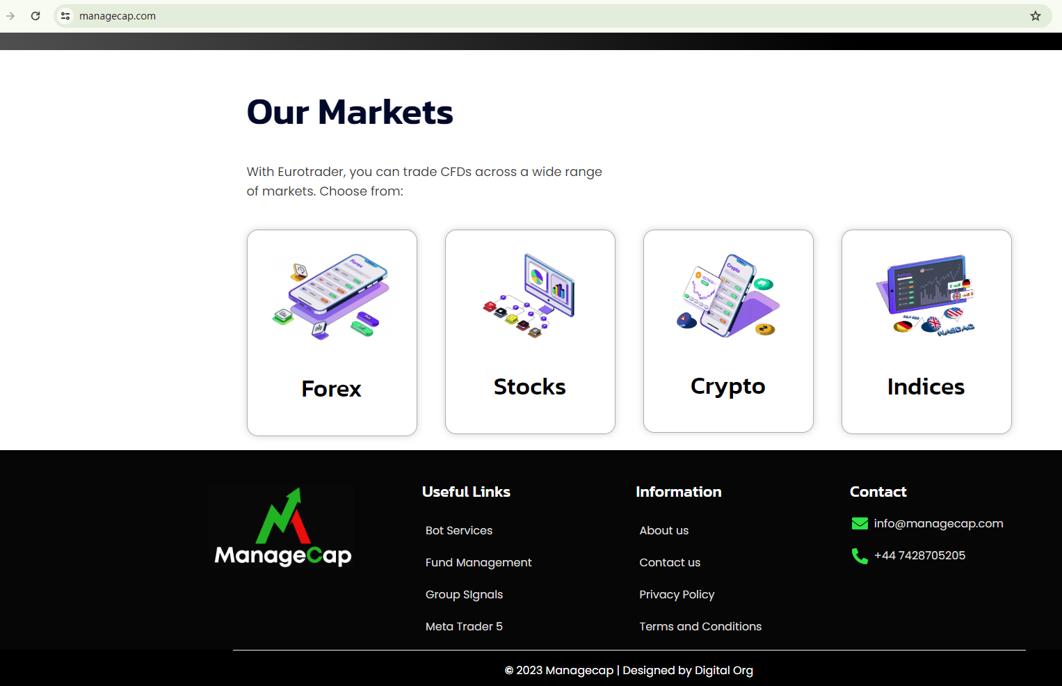 ManageCap doesn't disclose any information or details regarding its regulatory status, which is considered a scam indicator.While it has a UK phone number, suggesting a possible office in the UK, it hasn't secured the required license from the Financial Conduct Authority (FCA). As such, the FCA issued a warning about ManageCap, identifying it as an unauthorized firm.In essence, ManageCap is not regulated by any governing body. Entrusting this broker with investors' funds is highly risky, as there are no legal protections in place to safeguard the funds.ManageCap appears to be a scam.