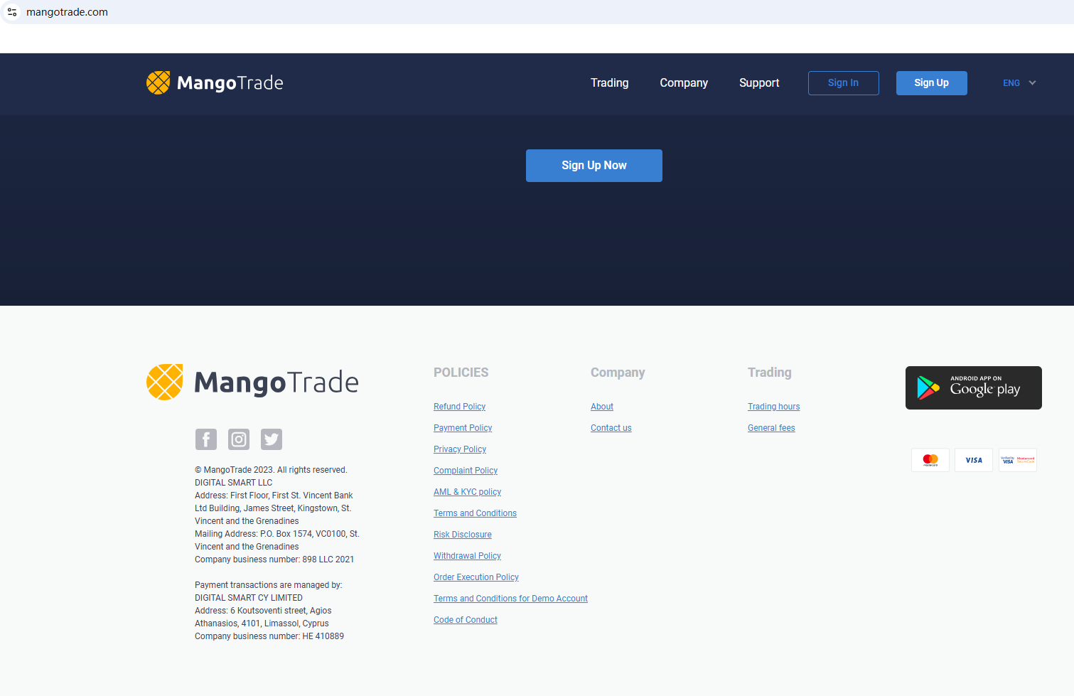 According to its website, it claims to be regulated by the Financial Services Authority (SVG FSA). Upon investigation, no matching information was found in the SVG FSA.In essence, Mango Trade is not regulated by any governing body. Entrusting it with investors' funds is highly risky, as there are no legal protections in place to safeguard the funds.Mango Trade appears to be a scam.