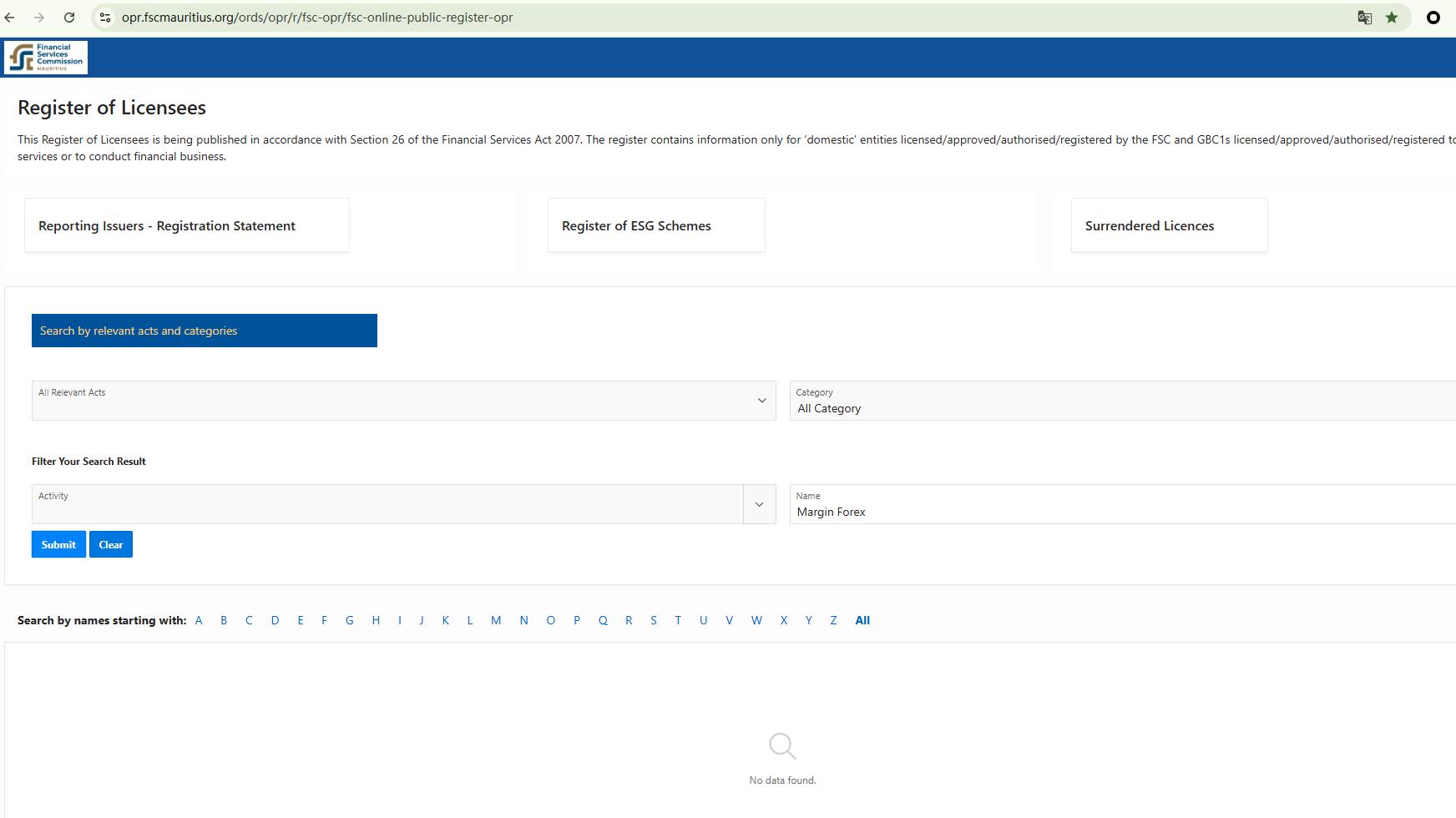 We searched the official register of the Financial Services Commission(FSC) in Mauritius using all available details, but found no record of Margin Forex or any associated company.