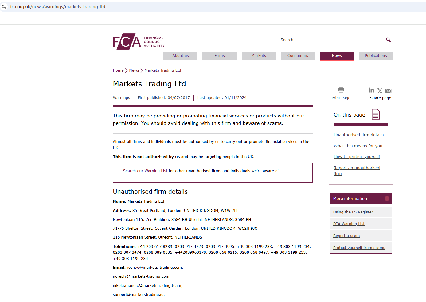 In addition, we found that the Financial Conduct Authority (FCA) issued a warning against Markets Trading Ltd, believing this company might be providing financial services or products without proper authorization in the UK.