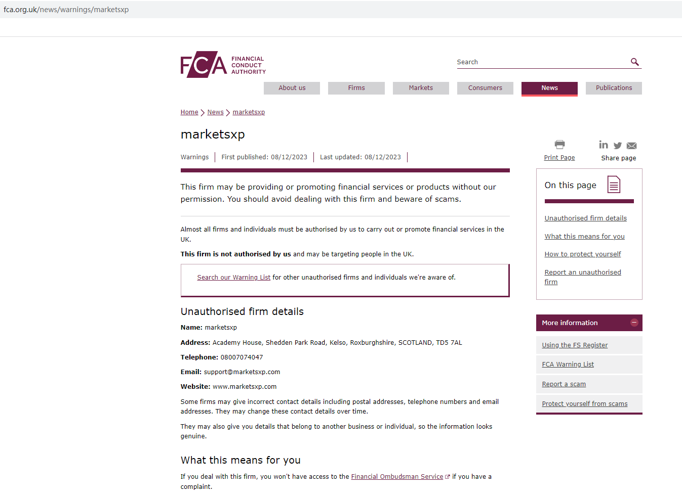 In addition, it claims registered in the Company House (CH) and register in the UK, after investigation, we found the relevant information in the CH, but the United Kingdom Financial Conduct Authority (UK FCA) issued a warning that marketsxp was providing financial services or products in the UK without authorisation, and it is illegal to register with CH without FCA authorization.