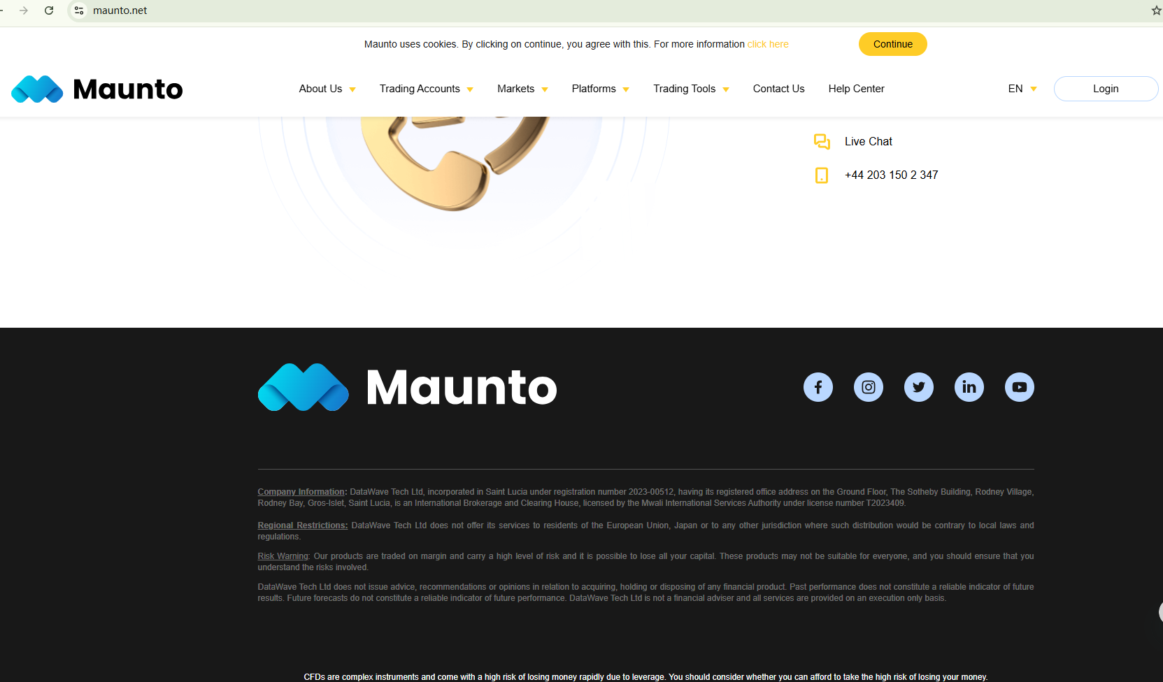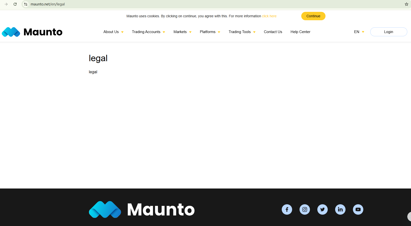Maunto seems to be a relatively new platform, with its domain name registered in January 2024. Generally, investors are advised to go with established trading platforms that have been tested by time and numerous traders. The credibility of a newly created platform should be questioned. The website doesn't provide adequate information about the company behind it, leaving people in the dark about its true legal status. No legal notices are posted, and the Legal page is blank. Maunto claims to be registered in St. Lucia, but offshore jurisdictions cannot provide the necessary protections for investors. In other words, Maunto is not effectively regulated.