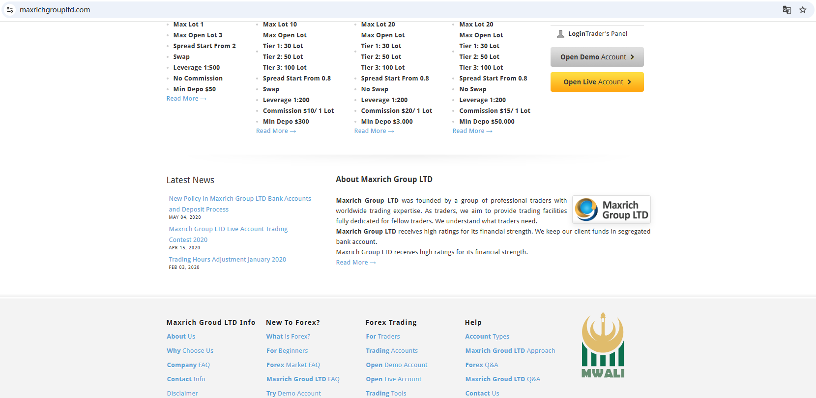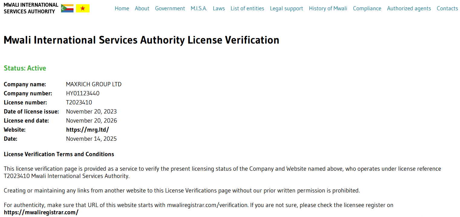 Maxrich Group Ltd claims to be authorized by the MWALI INTERNATIONAL SERVICES AUTHORITY (MISA). We find Maxrich Group Ltd in the MISA registry, but the approved domain is https://mrg.ltd/, instead of https://maxrichgroupltd.com/. This inconsistency is a major red flag for an unauthorized operation.