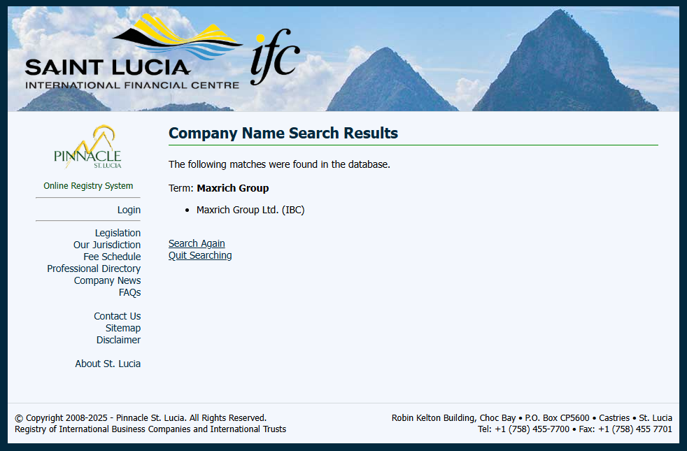 In addition, Maxrich Group Ltd appears in the Saint Lucia International Financial Centre (IFC) registry, but this registration only grants it International Business Company (IBC) status. This does not constitute a valid financial licence. The IFC neither regulates nor licenses forex trading activities.