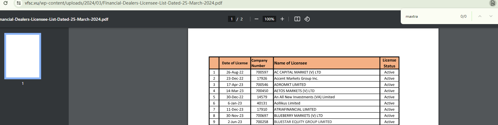 The firm alleges to be licensed by the Vanuatu Financial Services Commission (VFSC) under the number 700662. Yet, neither the supposed number nor the name "Maxtra" can be found on the VFSC register. A similar situation arises with the claimed registration with the Financial Services Authority of St. Vincent and the Grenadines (SVG FSA).