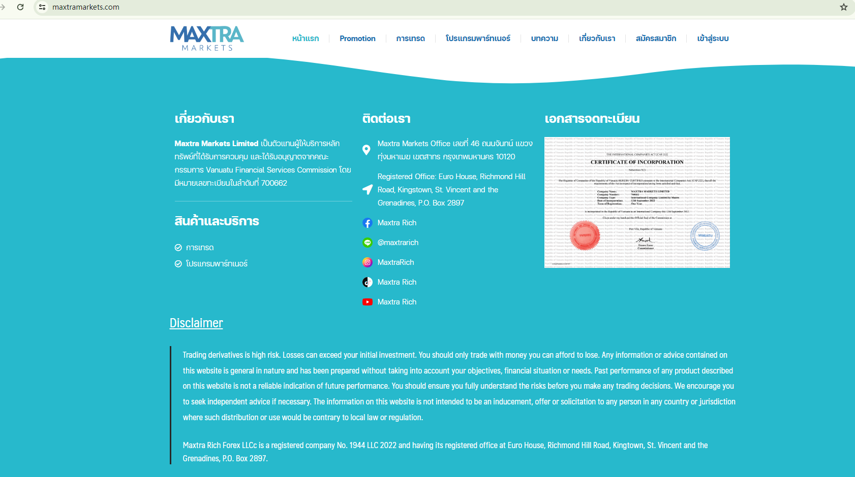Additionally, the website content is presented in Thai, and the entity claims to be based in Bangkok, Thailand. Despite this, it fails to provide any substantiating evidence of its legitimacy in the country, suggesting potential non-compliance with relevant regulations.