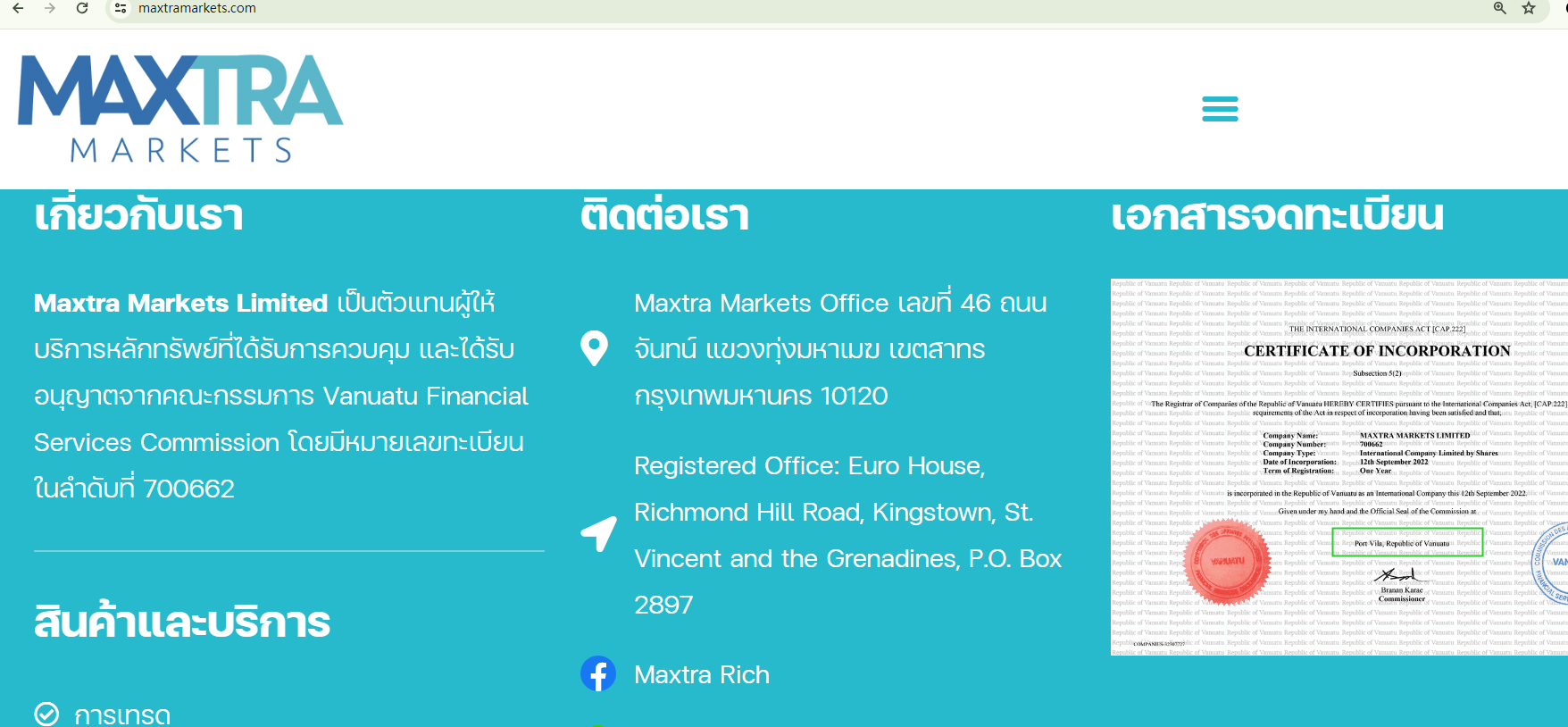 Maxtra Markets claims to hold licenses from two financial regulators. However, our checks with the relevant authorities indicate that its regulatory claims are entirely unfounded.The firm alleges to be licensed by the Vanuatu Financial Services Commission (VFSC) under the number 700662. Yet, neither the supposed number nor the name "Maxtra" can be found on the VFSC register. A similar situation arises with the claimed registration with the Financial Services Authority of St. Vincent and the Grenadines (SVG FSA).Additionally, the website content is presented in Thai, and the entity claims to be based in Bangkok, Thailand. Despite this, it fails to provide any substantiating evidence of its legitimacy in the country, suggesting potential non-compliance with relevant regulations.In essence, Maxtra Markets is not regulated by any governing body. Entrusting it with investors' funds is highly risky, as there are no legal protections in place to safeguard the funds.Maxtra Markets appears to be a scam.