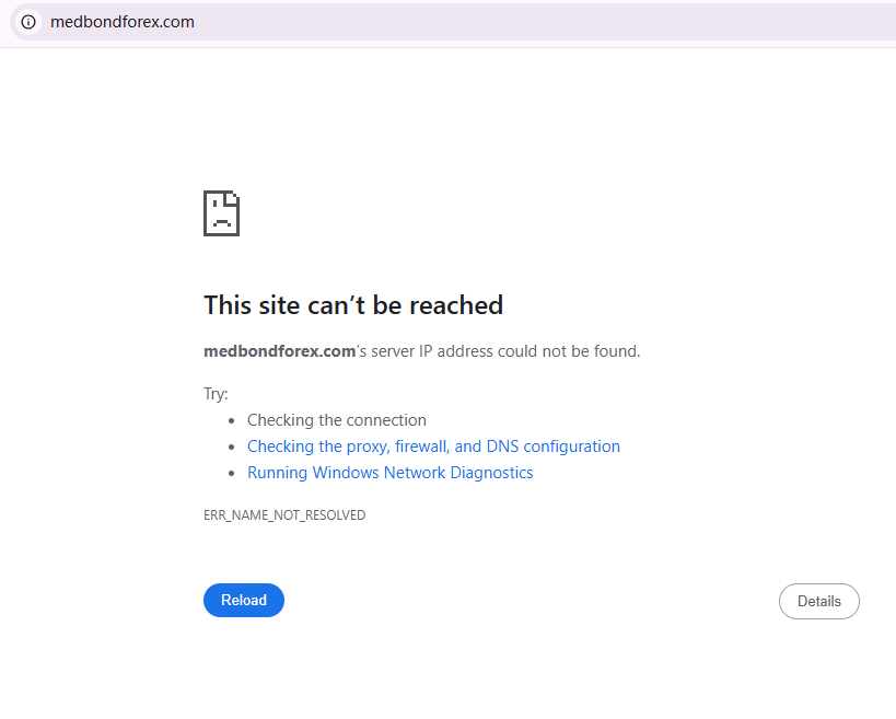 BrokersView found that the domain "https://medbondforex.com/" is currently inaccessible. This is widely regarded as a significant red flag, as the suspension of a broker's website often points to underlying regulatory or operational issues.