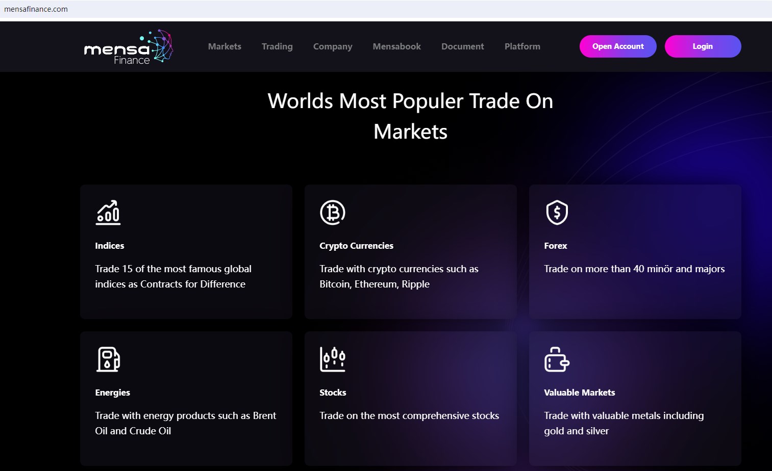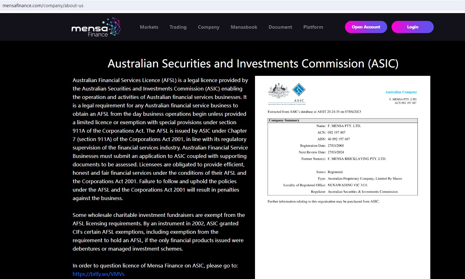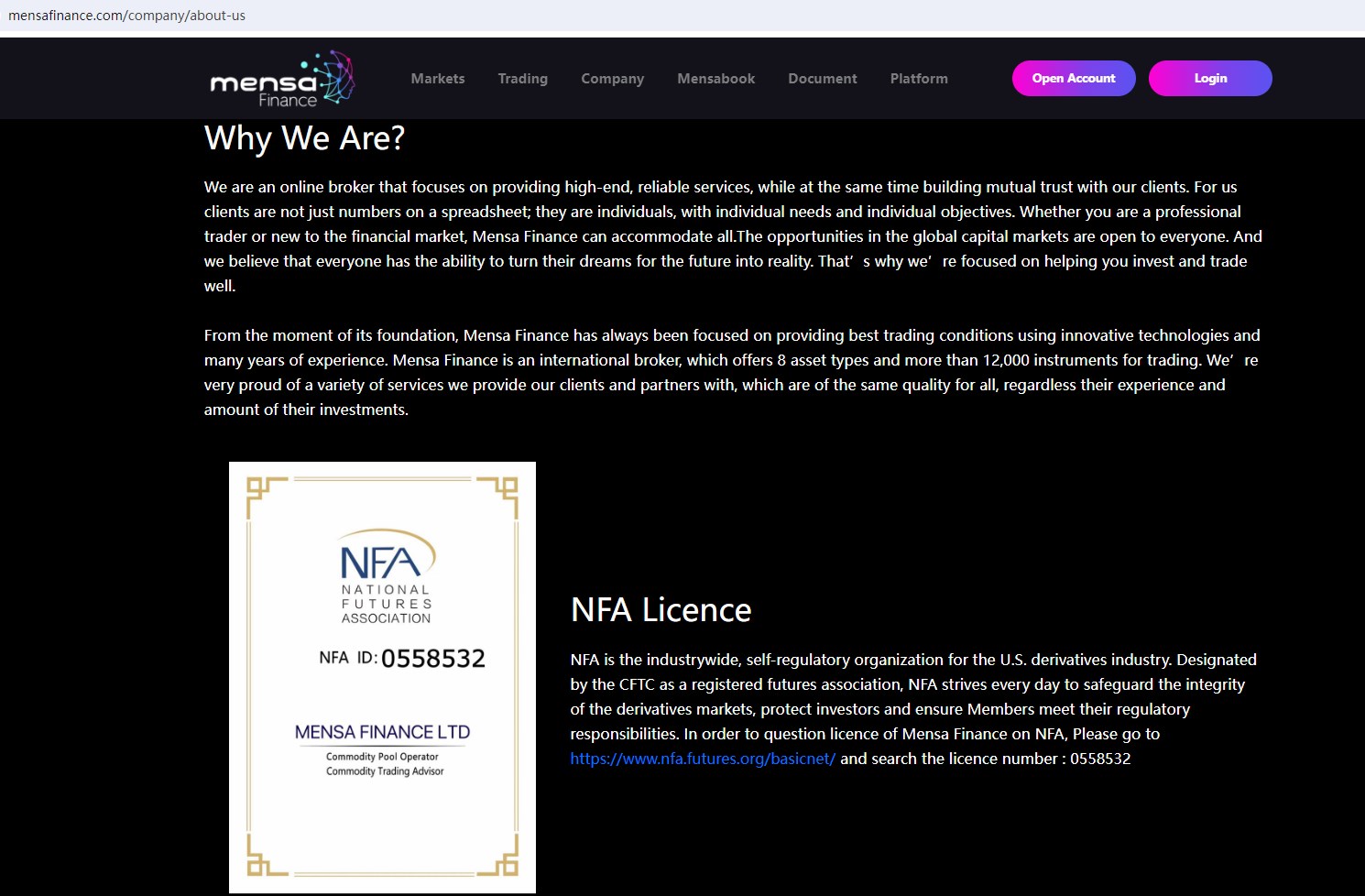 Mensa Finance claims to be a online broker regulated by the U.S. National Futures Association (NFA) with the licence number 0558532, and owned by F. MENSA PTY. LTD. authorized by the Australian Securities and Investment Commission (ASIC), offering wide range of financial services, including Indices, Crypto Currencies, Forex, Energies, Stocks and more instruments in global markets.