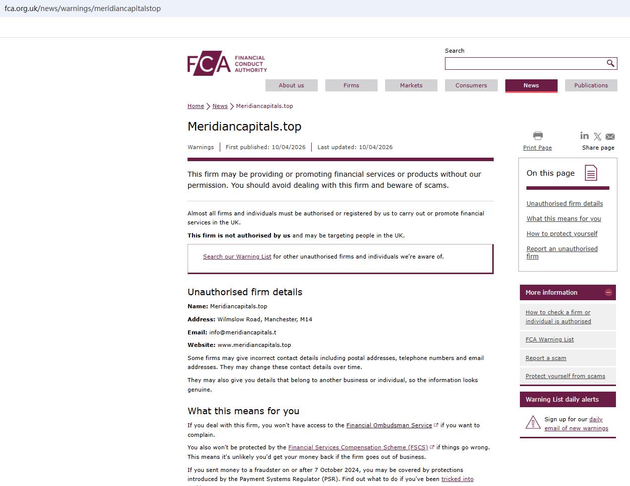 On April 10, 2026, the Financial Conduct Authority (FCA) issued a warning regarding MeridianCapitals, suspecting that this company may be offering financial services or products without the necessary authorization. https://www.fca.org.uk/news/warnings/meridiancapitalstop