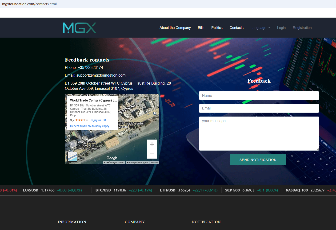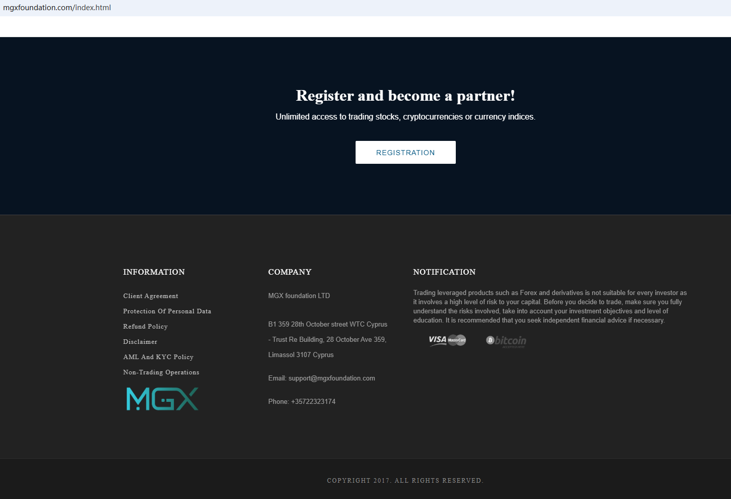 According to its website, it claims to be a reliable company, but does not display any valid regulatory information on the website. Its office address is located in Cyprus, and upon investigation, no matching information was found in Cyprus Securities and Exchange Commission (CySEC).