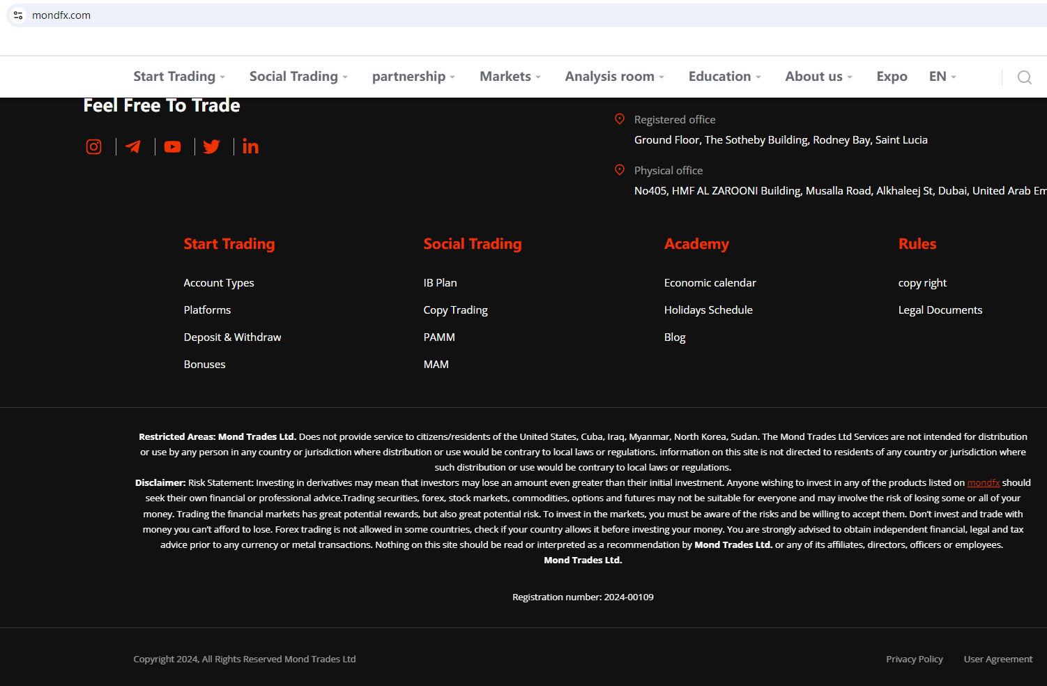 According to its website, it is regulated by Saint Lucia and its address is in the UAE. It is worth noting that Saint Lucia does not have foreign exchange regulatory authority. In addition, upon investigation, no matching information was found in the Securities and Commodities Authority (SCA), the Dubai Financial Services Authority (DFSA), and the Central Bank of the UAE (CBUAE).In essence, MondFX is not regulated by any governing body. Entrusting it with investors' funds is highly risky, as there are no legal protections in place to safeguard the funds.MondFX appears to be a scam.