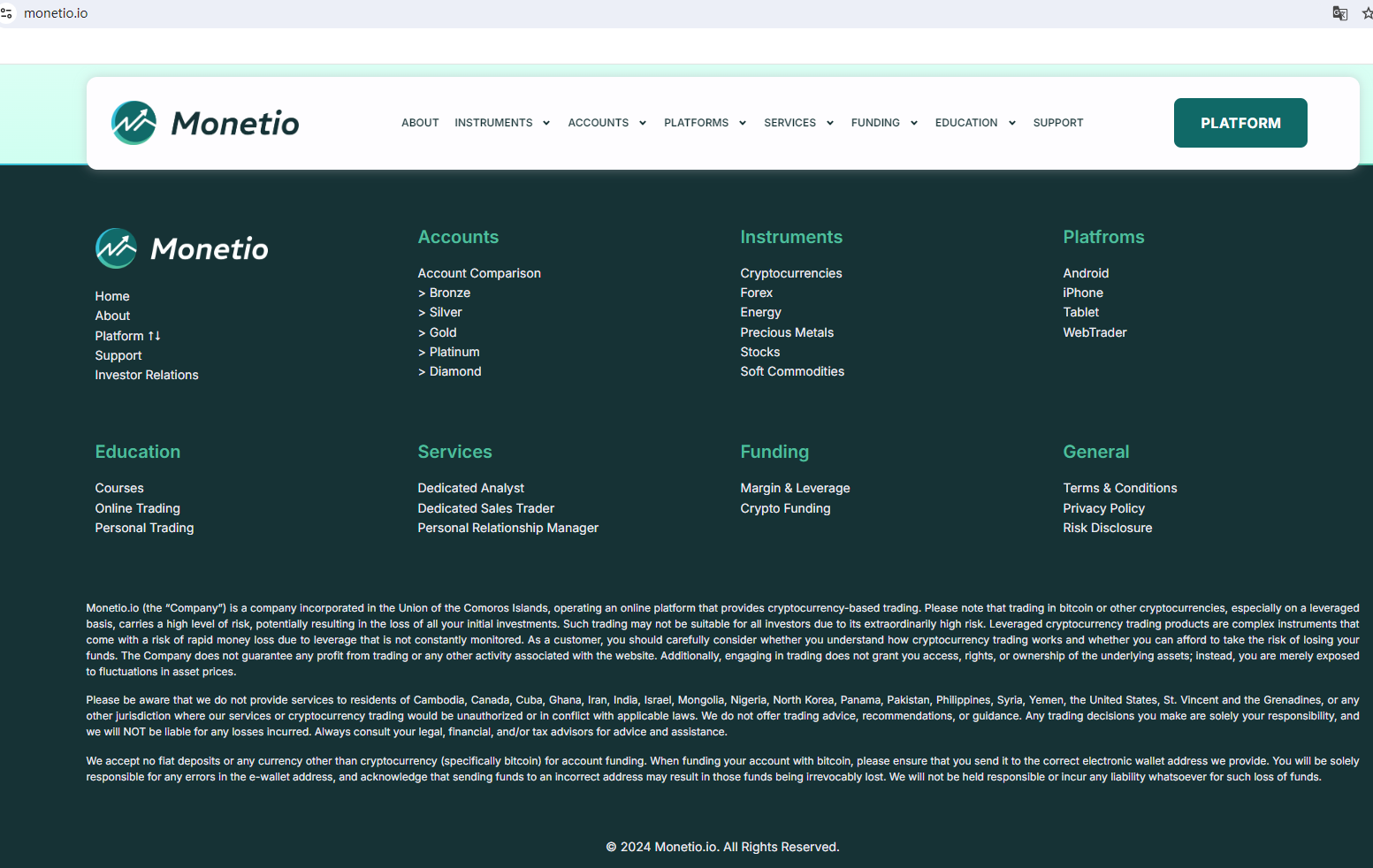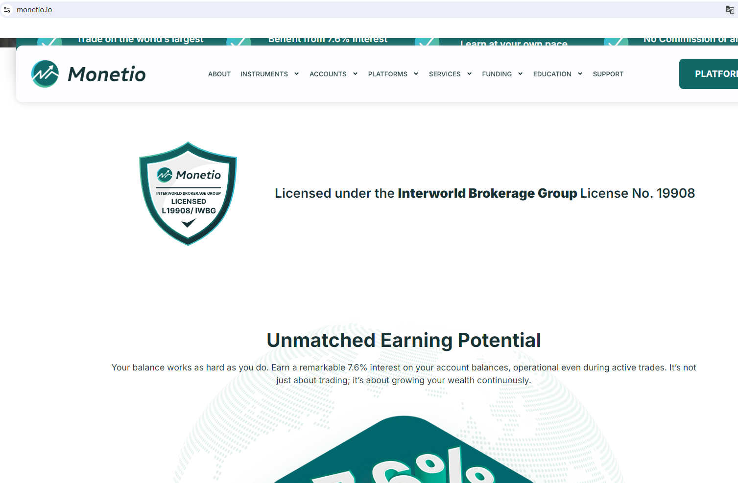 According to its website, it is regulated by Interworld Brokerage Group, but after searching, there is no relevant information showing that the agency has the authority to regulate foreign exchange. In addition, it is located in Comoros. Upon investigation, no matching information was found in the MWALI INTERNATIONAL SERVICES AUTHORITY (MISA).What's more, we found that the Financial Conduct Authority (FCA) issued a warning against Monetio, believing this company might be providing financial services or products without proper authorization in the UK. In essence, Monetio is not regulated by any governing body. Entrusting it with investors' funds is highly risky, as there are no legal protections in place to safeguard the funds.Monetio appears to be a scam.
