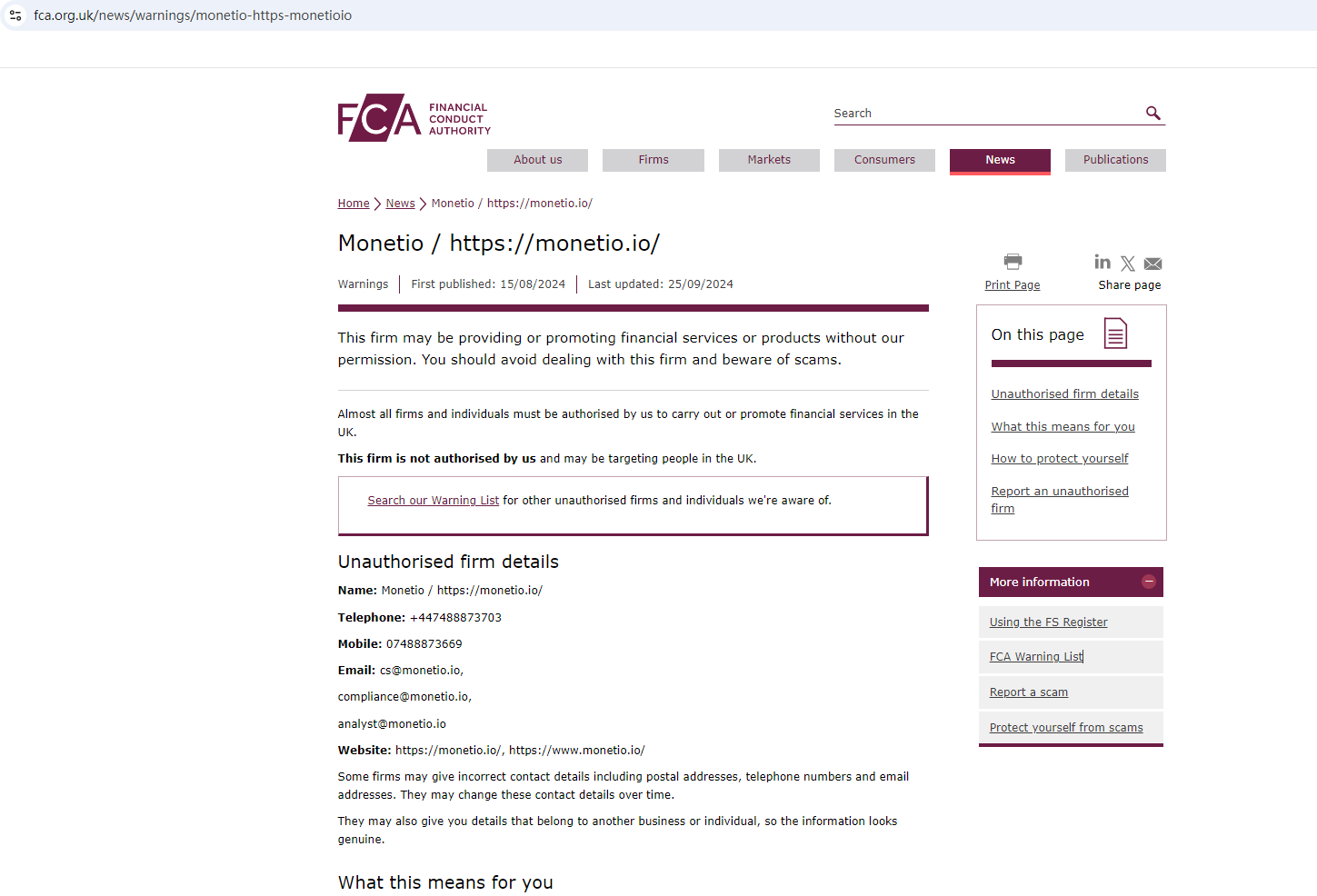 What's more, we found that the Financial Conduct Authority (FCA) issued a warning against Monetio, believing this company might be providing financial services or products without proper authorization in the UK.