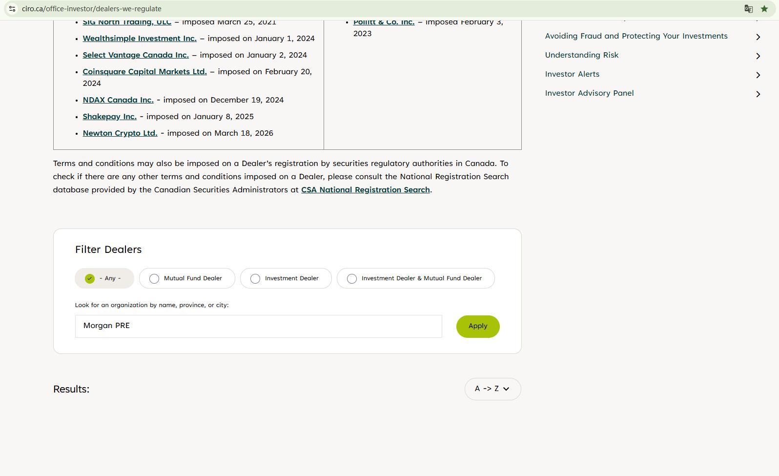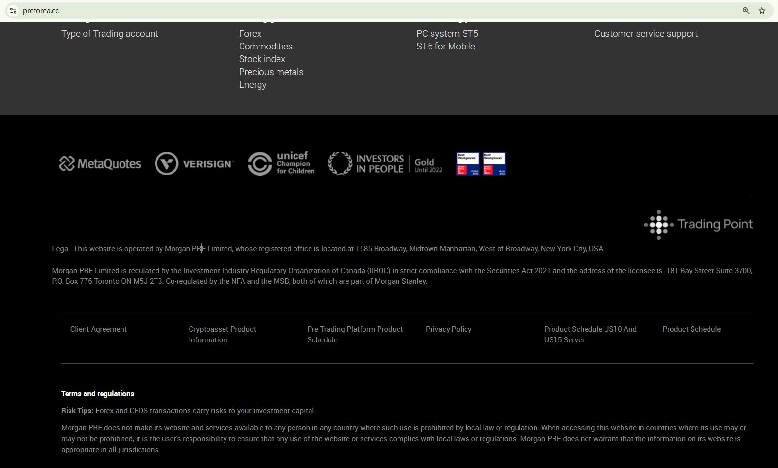 Morgan Pre claims to be operated by Morgan PRE Limited and regulated by the Investment Industry Regulatory Organization of Canada (IIROC), asserting that it is co-regulated by the National Futures Association (NFA) and holds an MSB license. However, our investigation reveals that neither the IIROC nor the NFA has registered the entity Morgan PRE Limited. This indicates that their claims are likely fabricated and intended to mislead investors.