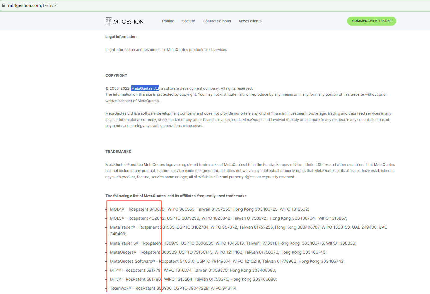 Furthermore, MT GESTION inappropriately uses information from MetaQuotes Ltd, a well-known software company, in its legal notices to appear legitimate. This misuse does not lend it any credibility.