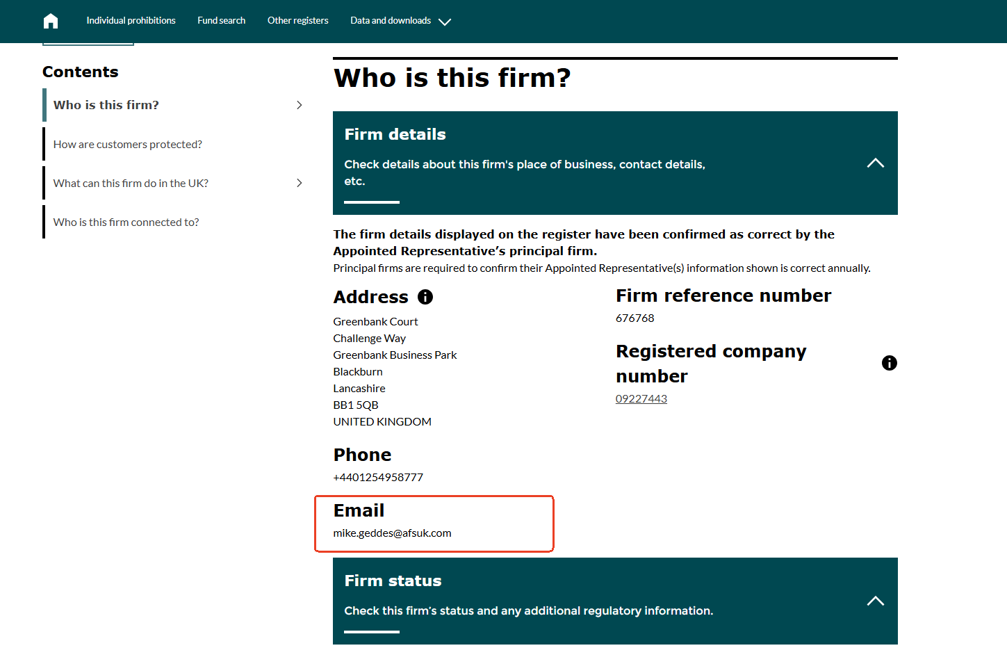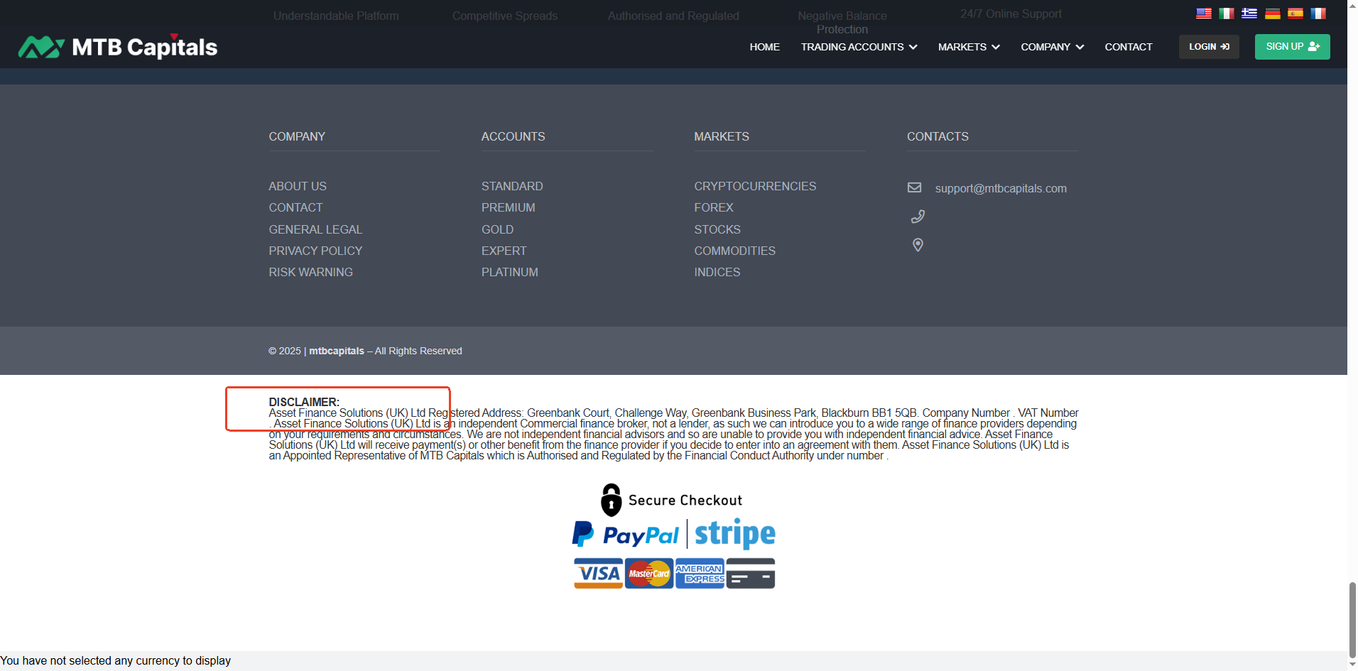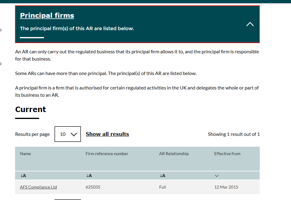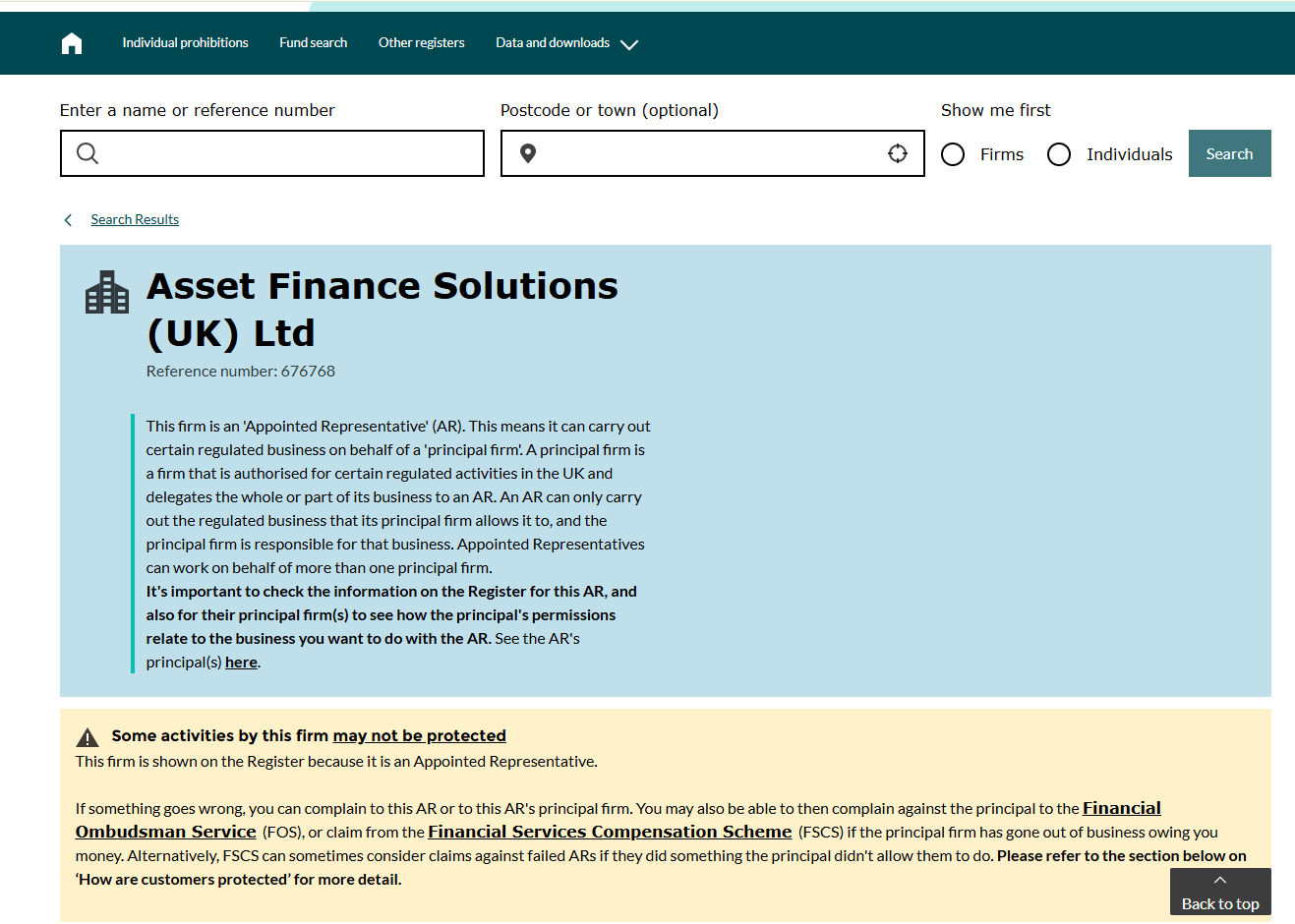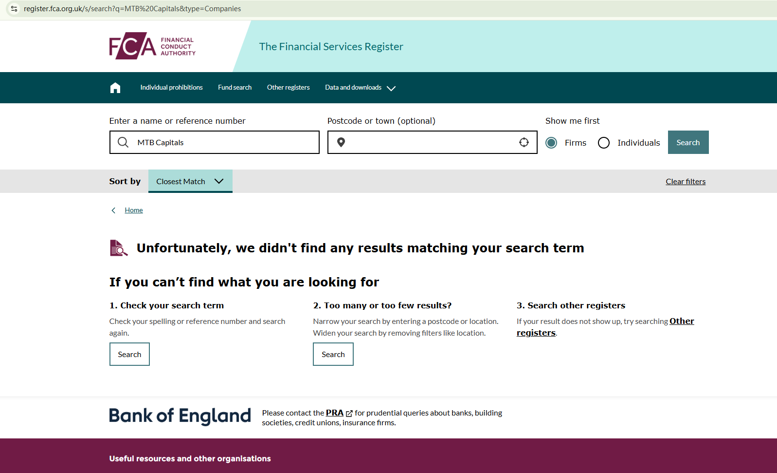MTB Capitals claims that Asset Finance Solutions (UK) Ltd is its Appointed Representative regulated by the Financial Conduct Authority (FCA). However, official FCA records confirm that while Asset Finance Solutions (UK) Ltd is indeed registered as an Appointed Representative, its principal firm is AFS Compliance Ltd, not MTB Capitals. Additionally, the website listed in the FCA registration does not belong to MTB Capitals, further undermining the credibility of their claims.