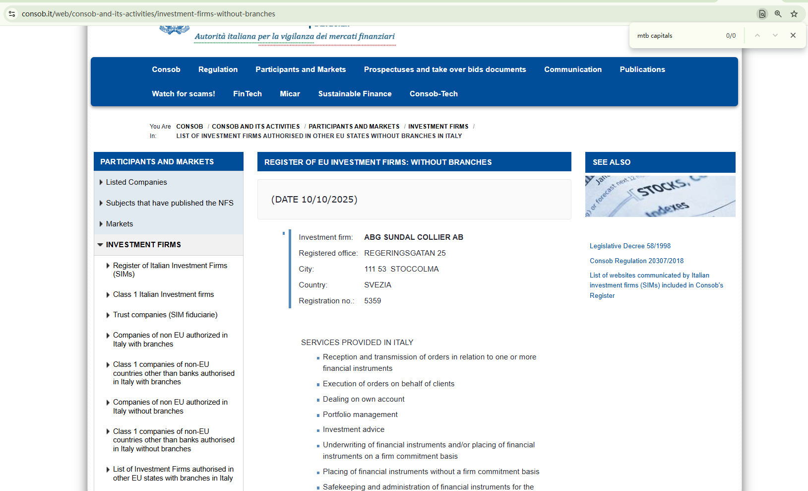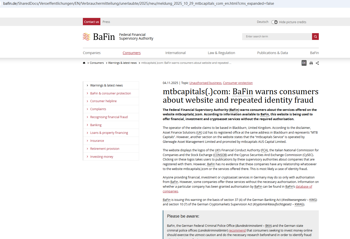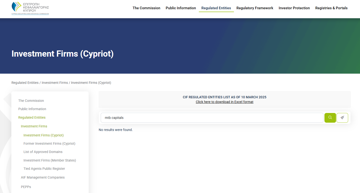 MTB Capitals also references authorization from the Cyprus Securities and Exchange Commission (CySEC) and Italy’s Commissione Nazionale per le Società e la Borsa (CONSOB). A thorough search of both regulators’ official registers reveals no entity connected to MTB Capitals holding a valid license. This indicates that their representation of being regulated in Cyprus and Italy is false and misleading.