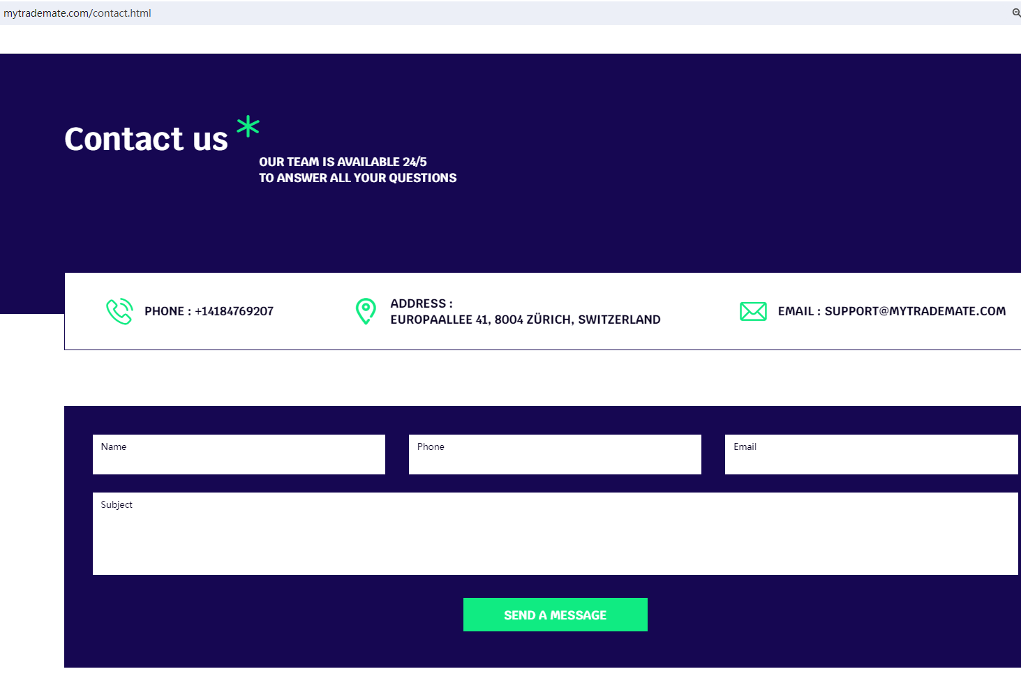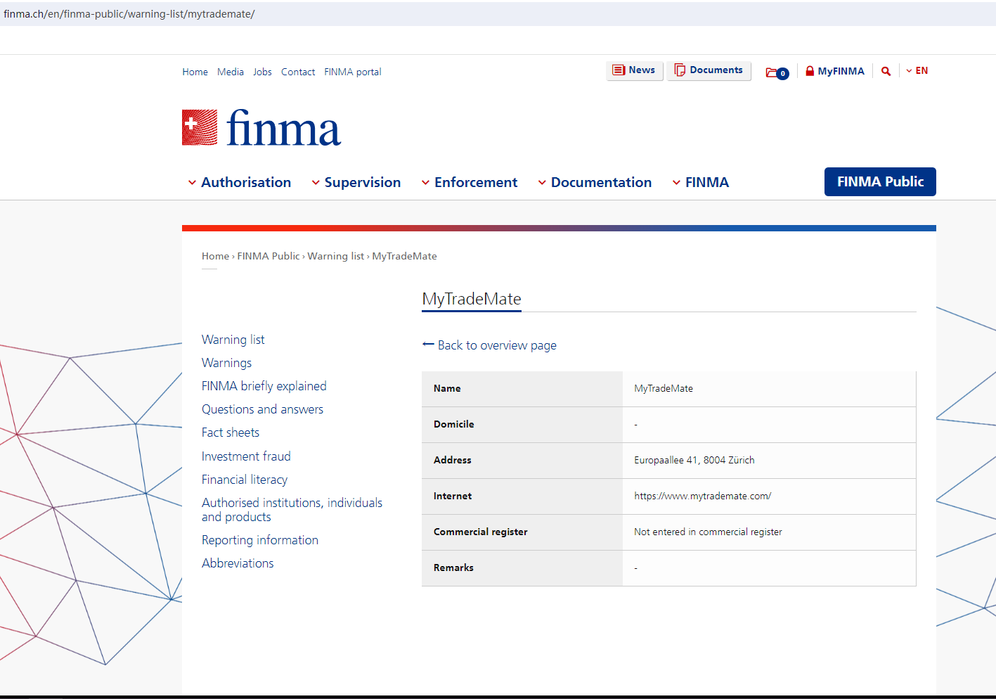 According to its website, it is located in Switzerland, but upon investigation, the Swiss Financial Market Supervisory Authority (FINMA) issued a warning that MyTradeMate was providing financial services or products without authorisation.