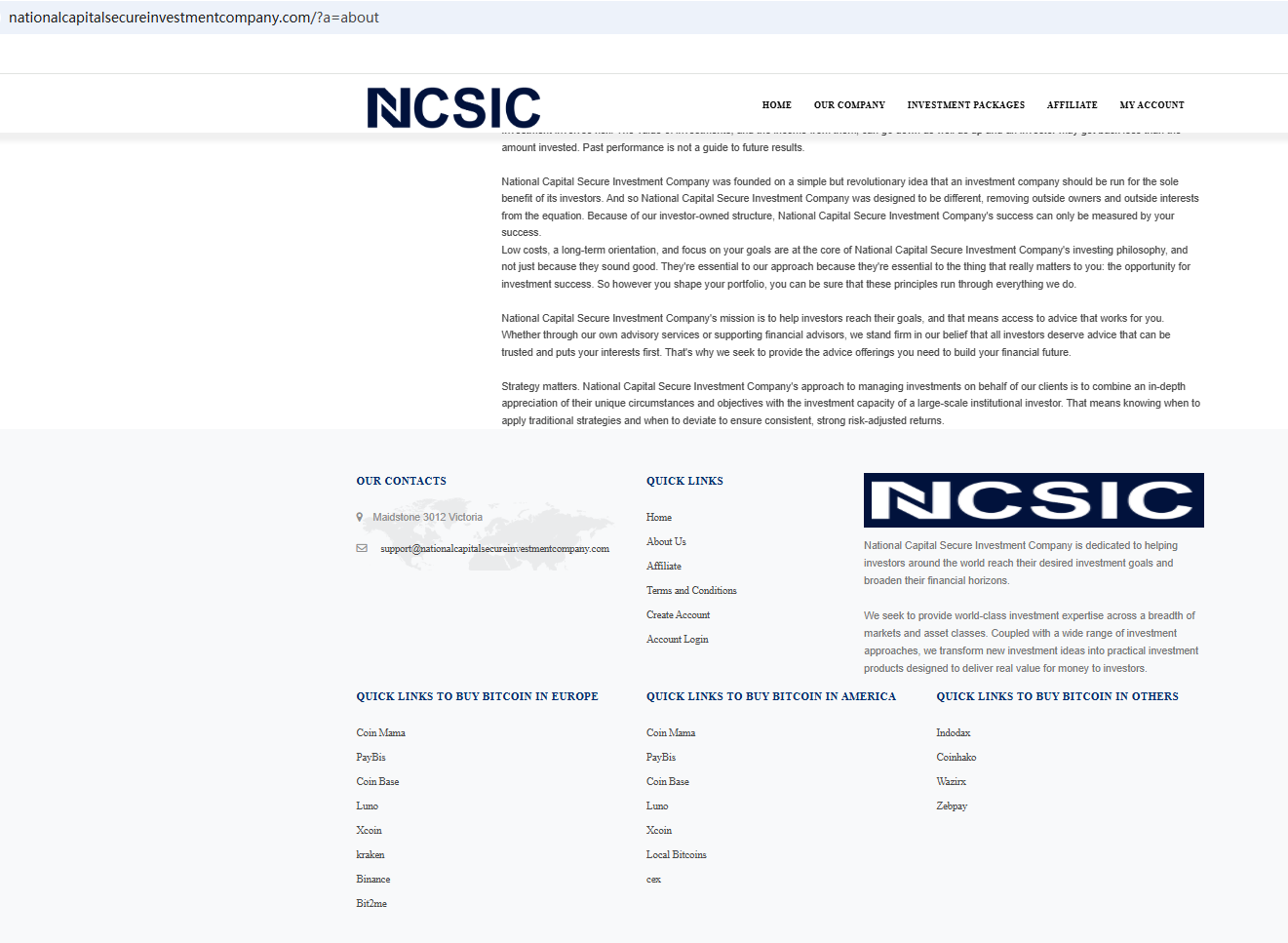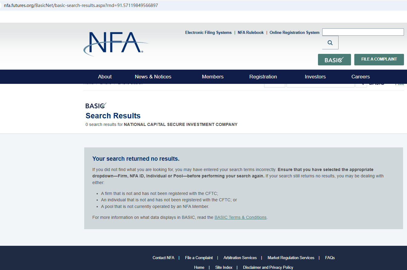 According to its website, it claims to be a reliable company located in the United States. However, a search revealed no matching information in the National Futures Association (NFA) database. In addition, the Financial Conduct Authority (FCA) issued a warning regarding NCSIC (NATIONAL CAPITAL SECURE INVESTMENT COMPANY), suspecting that this company may be offering financial services or products without the necessary authorization.