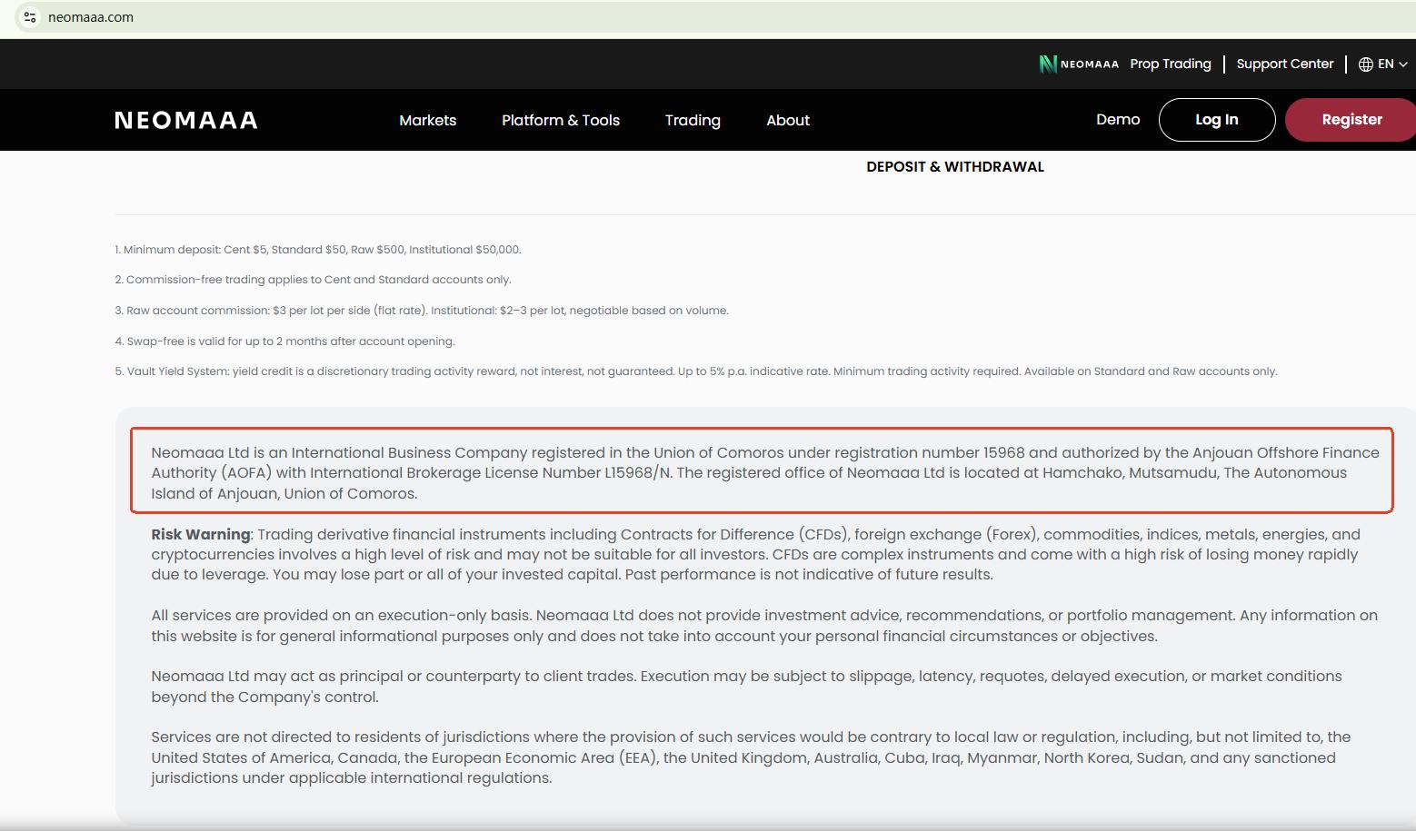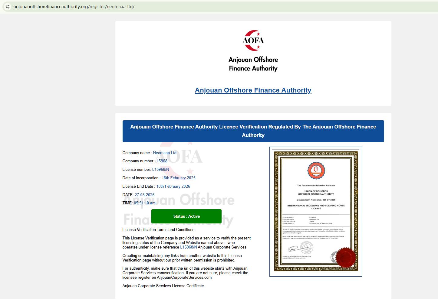 NEOMAAA claims to be regulated by the Anjouan Offshore Finance Authority (AOFA) in Comoros. However, the AOFA is an offshore regulatory body that is known for its weak oversight and lack of international recognition. The jurisdiction offers limited investor protection, and its regulatory framework is generally considered to be unreliable by global financial standards.