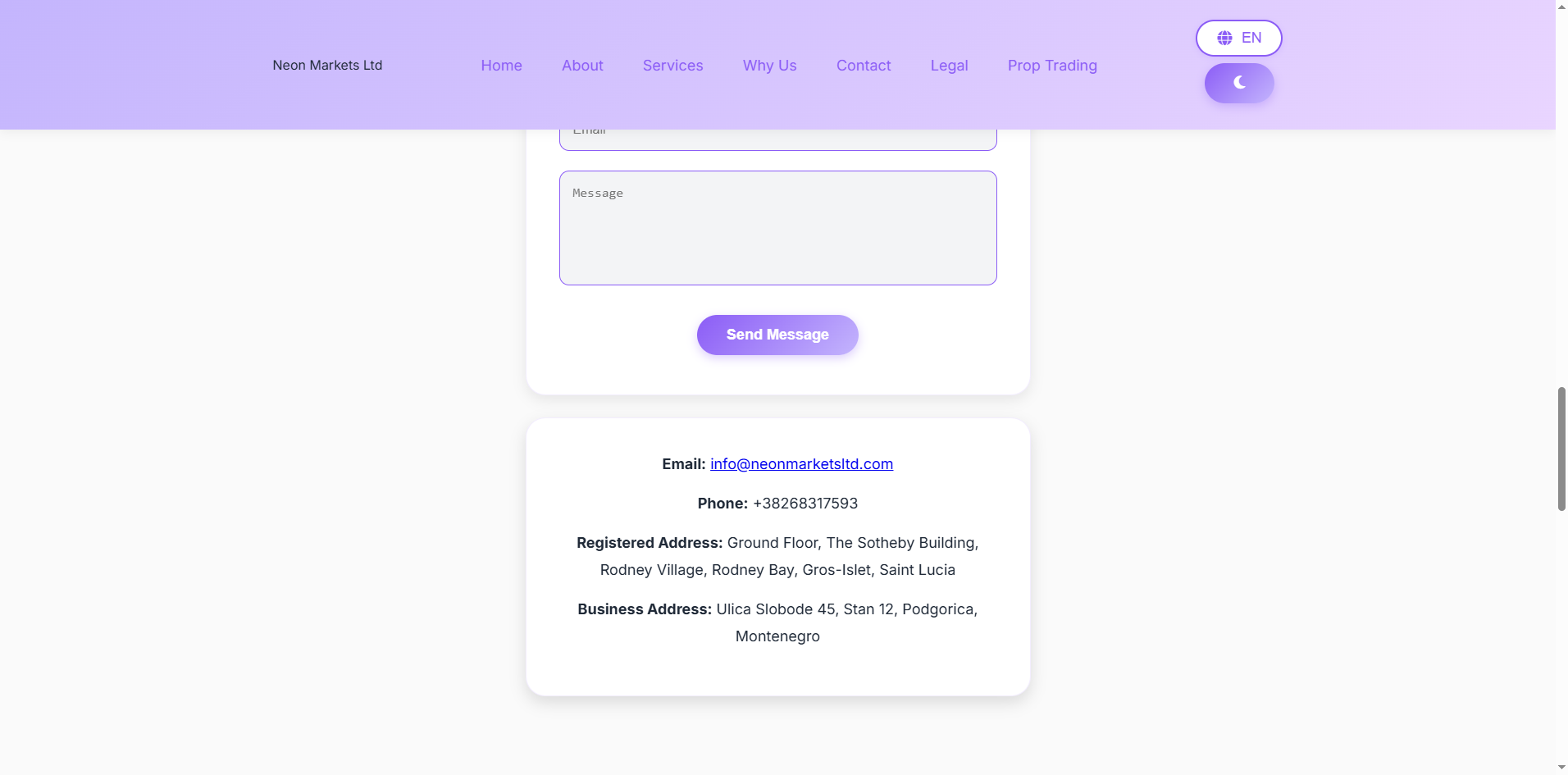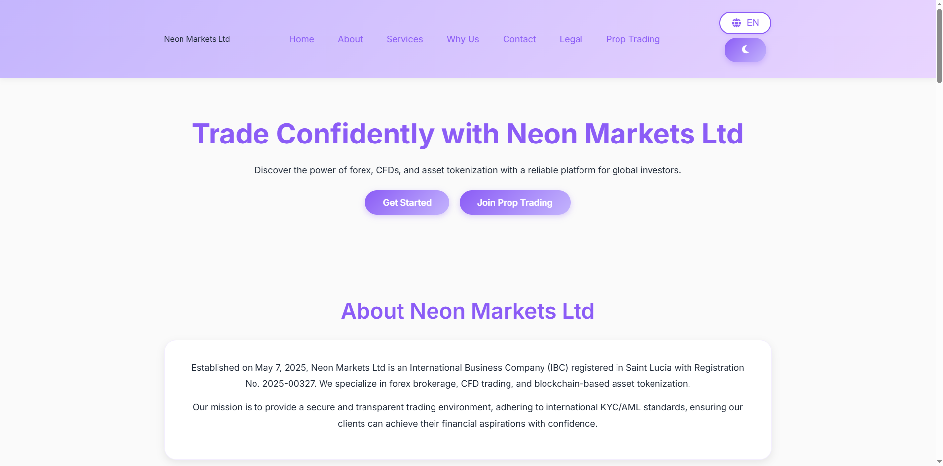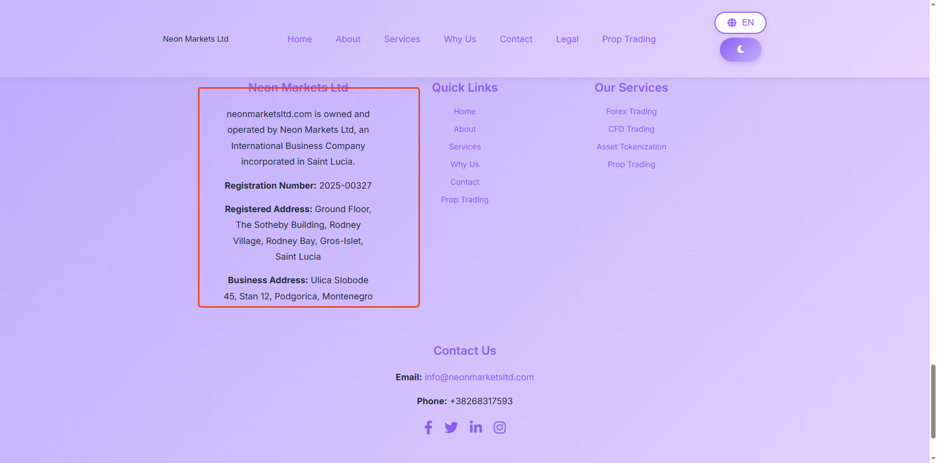 Neon Markets does not claim to hold any financial regulatory license; it only states that it is registered in Saint Lucia. While we can confirm that a company named Neon Markets exists in the registry of the Saint Lucia International Financial Centre (IFC), this registration merely grants it International Business Company (IBC) status, which is not a valid financial services license. The IFC does not regulate or authorize forex trading activities.