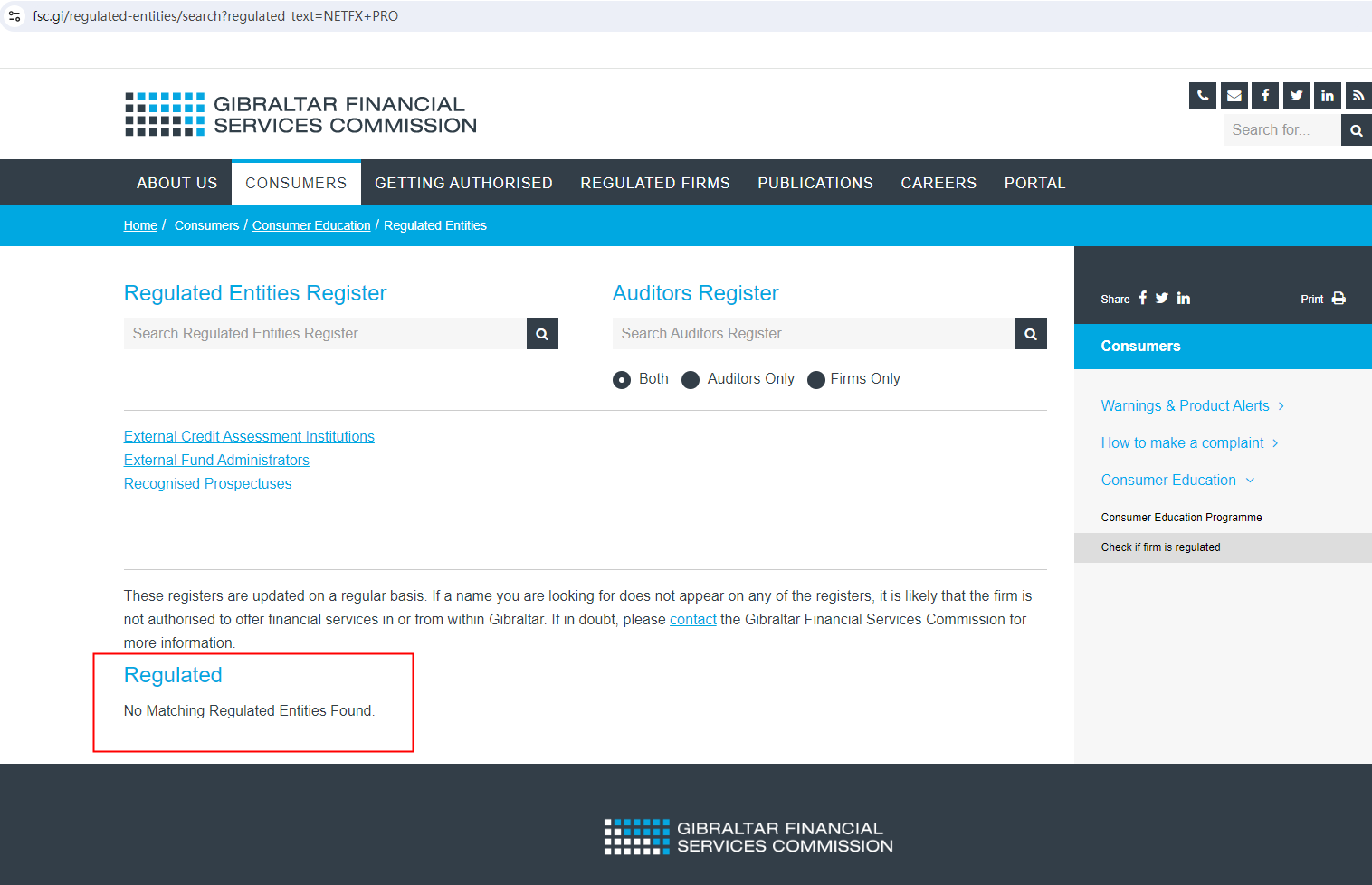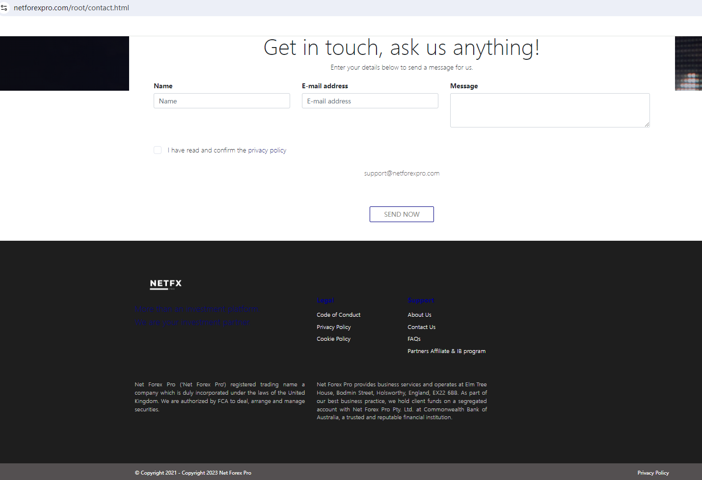 According to its website, it claims to be regulated by the Financial Conduct Authority (FCA), Australia Securities & Investment Commission (ASIC), the Cyprus Securities and Exchange Commission (CySEC), the Gibraltar Financial Services Commission (GFSC), Financial Crimes Enforcement Network (FinCEN) and the Financial Industry Regulatory Authority (FINRA). Upon investigation, no matching information was found in the ASIC, CySEC, GFSC, and FINRA. In addition, it displays a FinCen certificate on its website, but FinCen does not have the authority to regulate foreign exchange, so this is invalid.What's more, the Financial Conduct Authority (FCA) issued a warning against NETFX PRO, believing this company might be providing financial services or products without proper authorization in the UK.In essence, NETFX PRO is not regulated by any governing body. Entrusting it with investors' funds is highly risky, as there are no legal protections in place to safeguard the funds.NETFX PRO appears to be a scam.