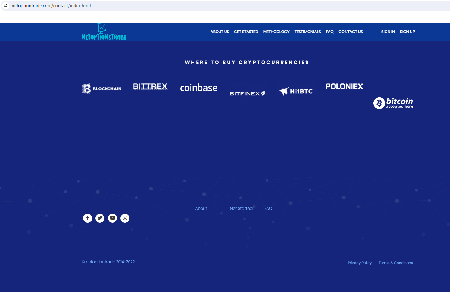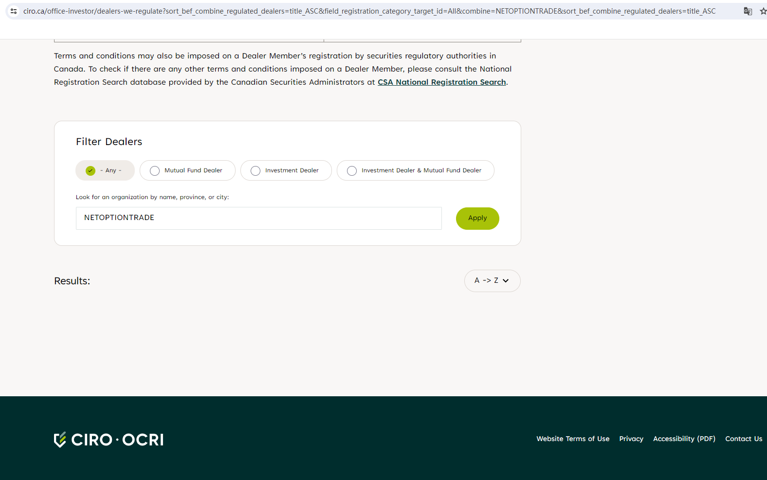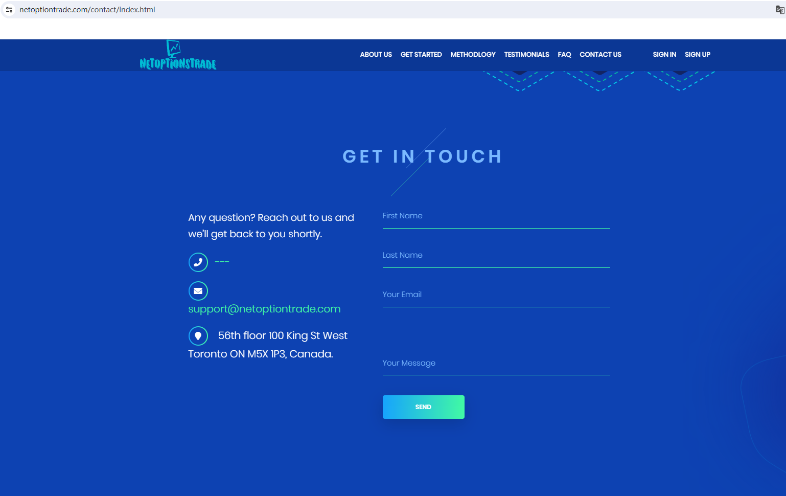 According to its website, it is located in Canada. Upon investigation, no matching information was found in the Investment Industry Regulatory Organization of Canada (IIROC).In essence, NETOPTIONTRADE is not regulated by any governing body. Entrusting it with investors' funds is highly risky, as there are no legal protections in place to safeguard the funds.NETOPTIONTRADE appears to be a scam.