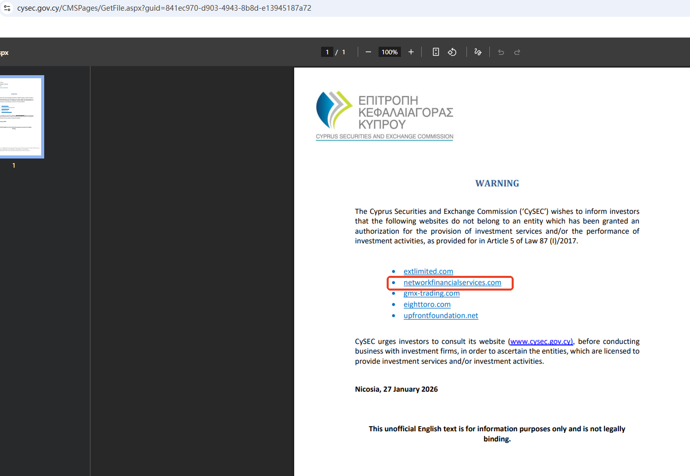 On Jan 27, 2026, the Cyprus Securities and Exchange Commission (CySEC) issued a warning against Network Financial Services, believing this company might be providing financial services or products without authorisation. You may visit: https://www.cysec.gov.cy/CMSPages/GetFile.aspx?guid=841ec970-d903-4943-8b8d-e13945187a72