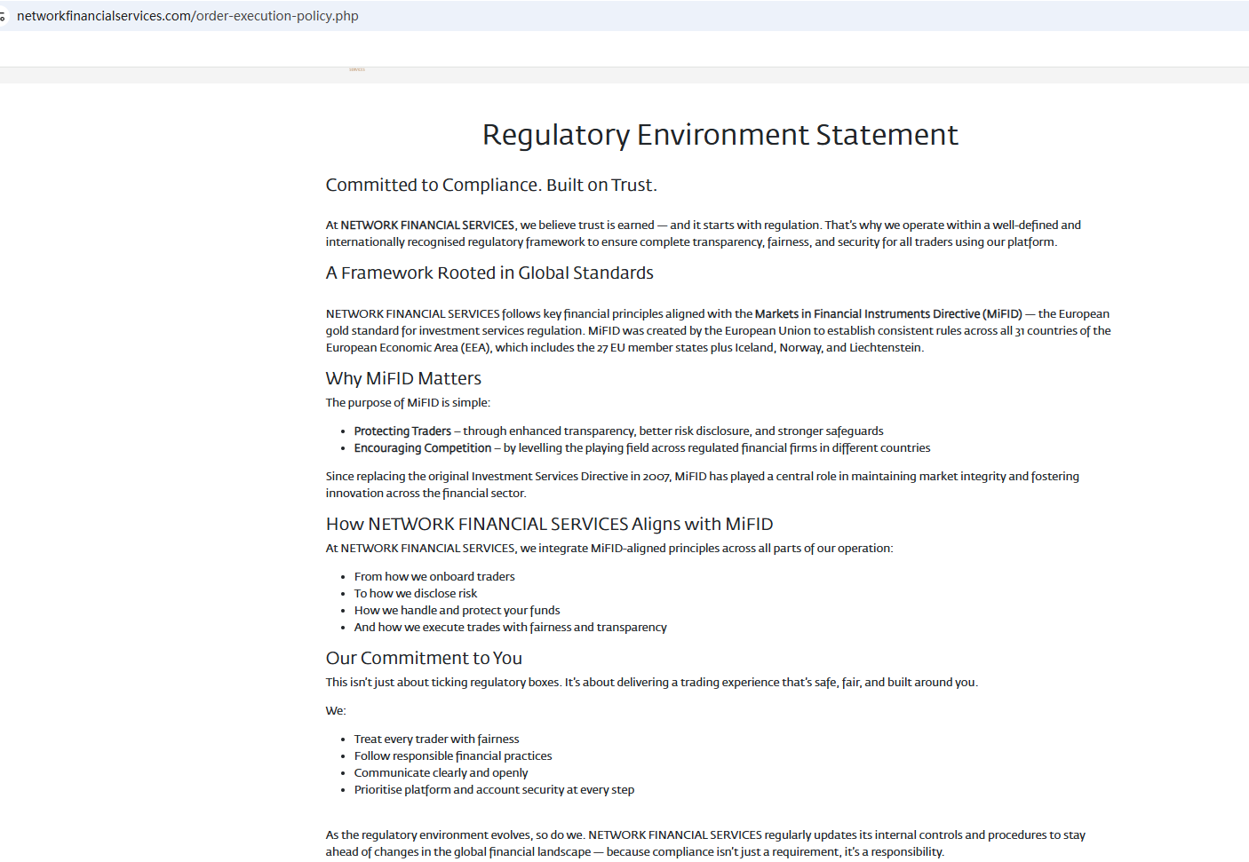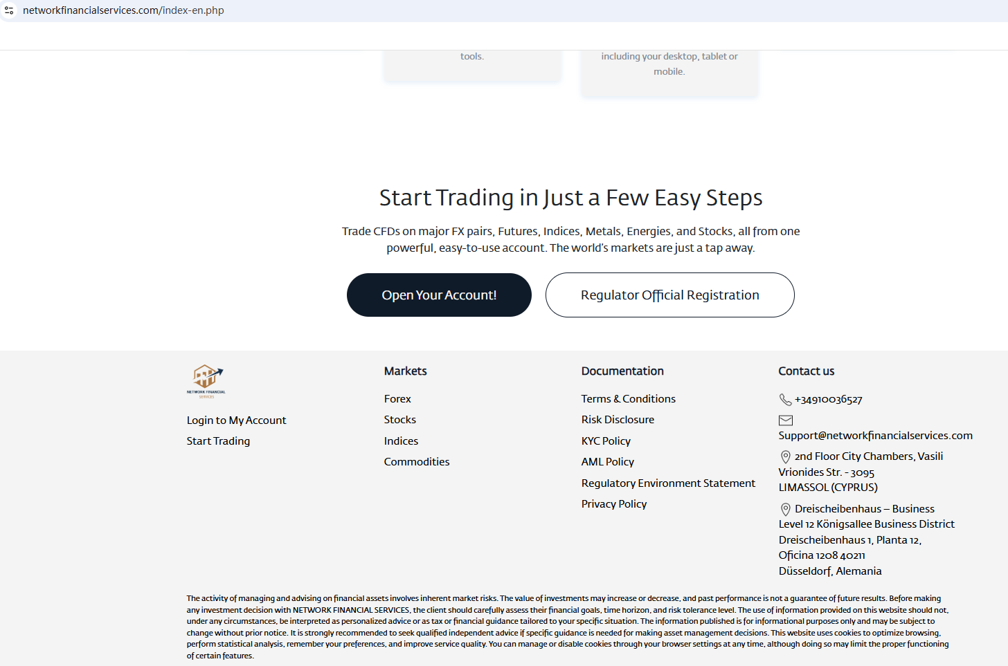 According to its website, it is located in Cyprus. Upon investigation, we found that the Cyprus Securities and Exchange Commission (CySEC) issued a warning against Network Financial Services, believing this company might be providing financial services or products without authorisation.