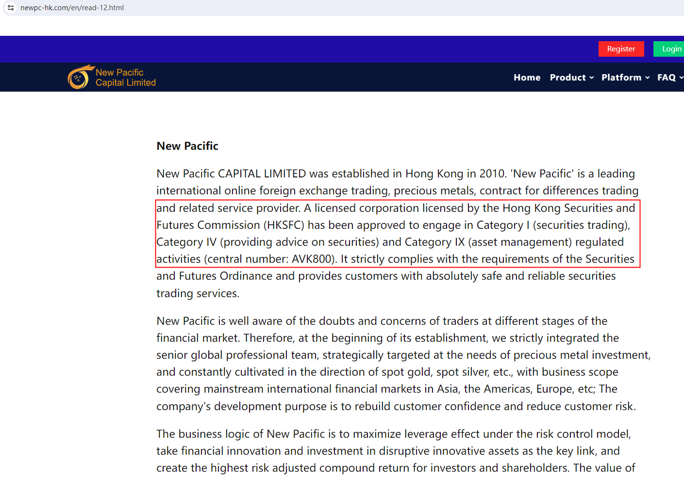 According to its website, It claimed that it was regulated by the Securities and Futures Commission(SFC), but after inquiries, it was found that the SFC issued a warning to it. In addition, it is worth our attention that the website is not associated with New Pacific Capital Limited, which is an SFC-licensed corporation.