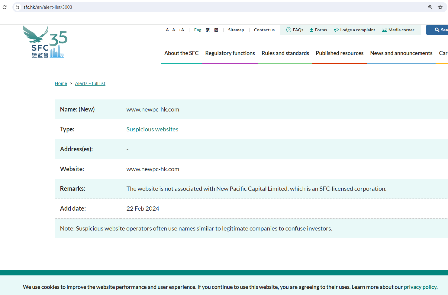 According to its website, It claimed that it was regulated by the Securities and Futures Commission(SFC), but after inquiries, it was found that the SFC issued a warning to it. In addition, it is worth our attention that the website is not associated with New Pacific Capital Limited, which is an SFC-licensed corporation.In essence, New Pacific is not regulated by any governing body. Entrusting it with investors' funds is highly risky, as there are no legal protections in place to safeguard the funds.New Pacific appears to be a scam.