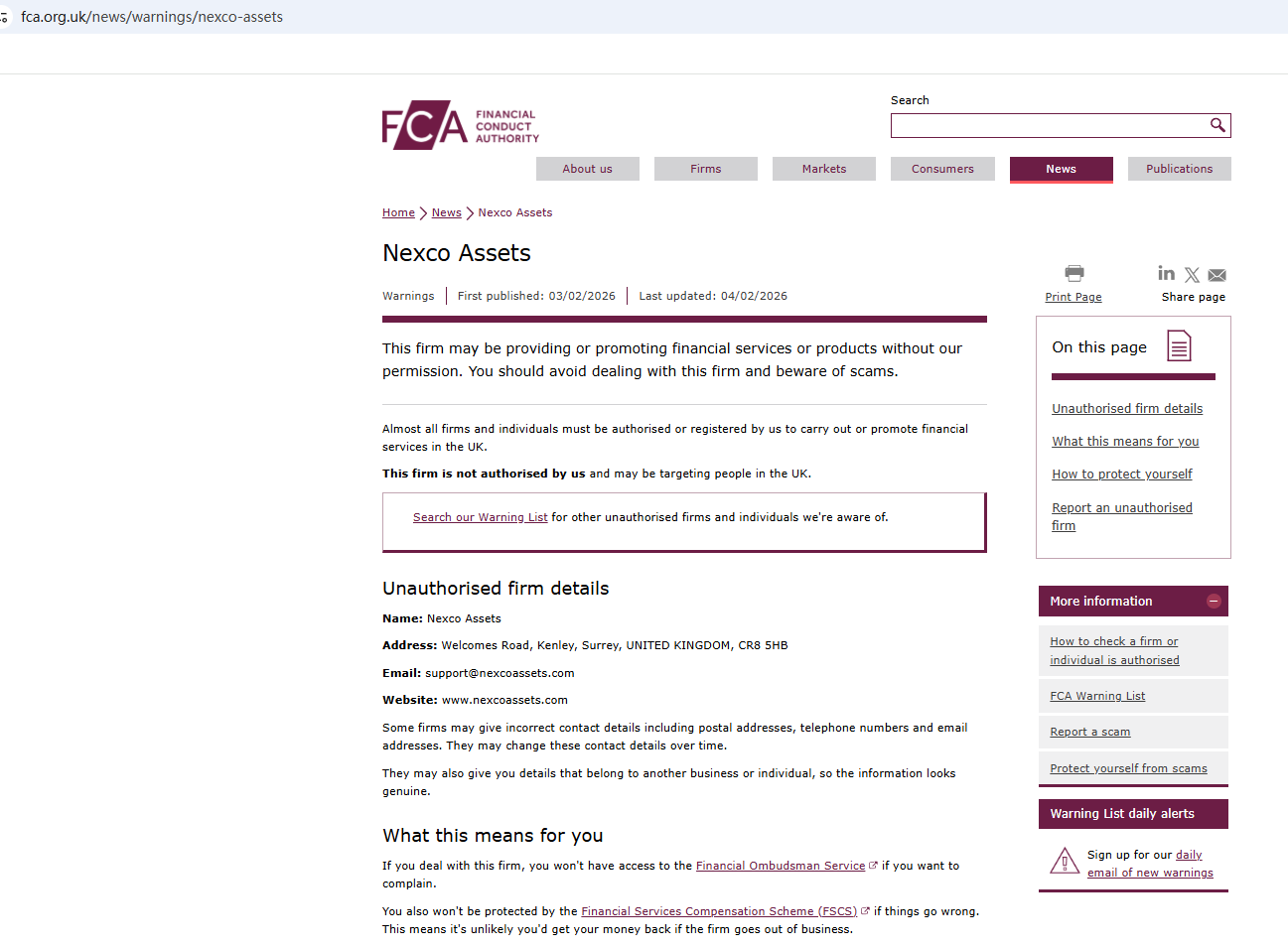 On Feb 4, 2026, the Financial Conduct Authority (FCA) issued a warning regarding Nexco Assets, suspecting that this company may be offering financial services or products without the necessary authorization. https://www.fca.org.uk/news/warnings/nexco-assets