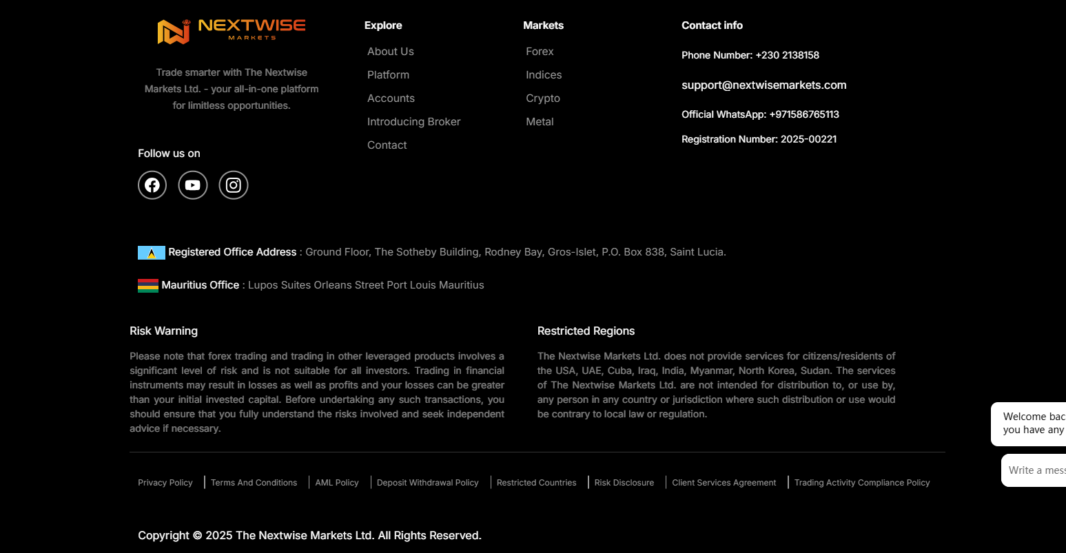 Nextwise Markets claims to operate under the name The Nextwise Markets Ltd., registered in Saint Lucia, with an additional office in Mauritius. While this entity is listed in the Saint Lucia International Financial Centre (IFC) registry, this registration only confers International Business Company (IBC) status, which does not constitute a legitimate financial services license.