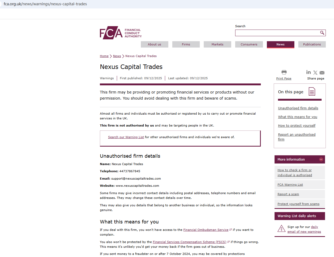 On Dec 9, 2025, the Financial Conduct Authority (FCA) issued a warning regarding Nexus Capital Trades, suspecting that this company may be offering financial services or products without the necessary authorization. https://www.fca.org.uk/news/warnings/nexus-capital-trades