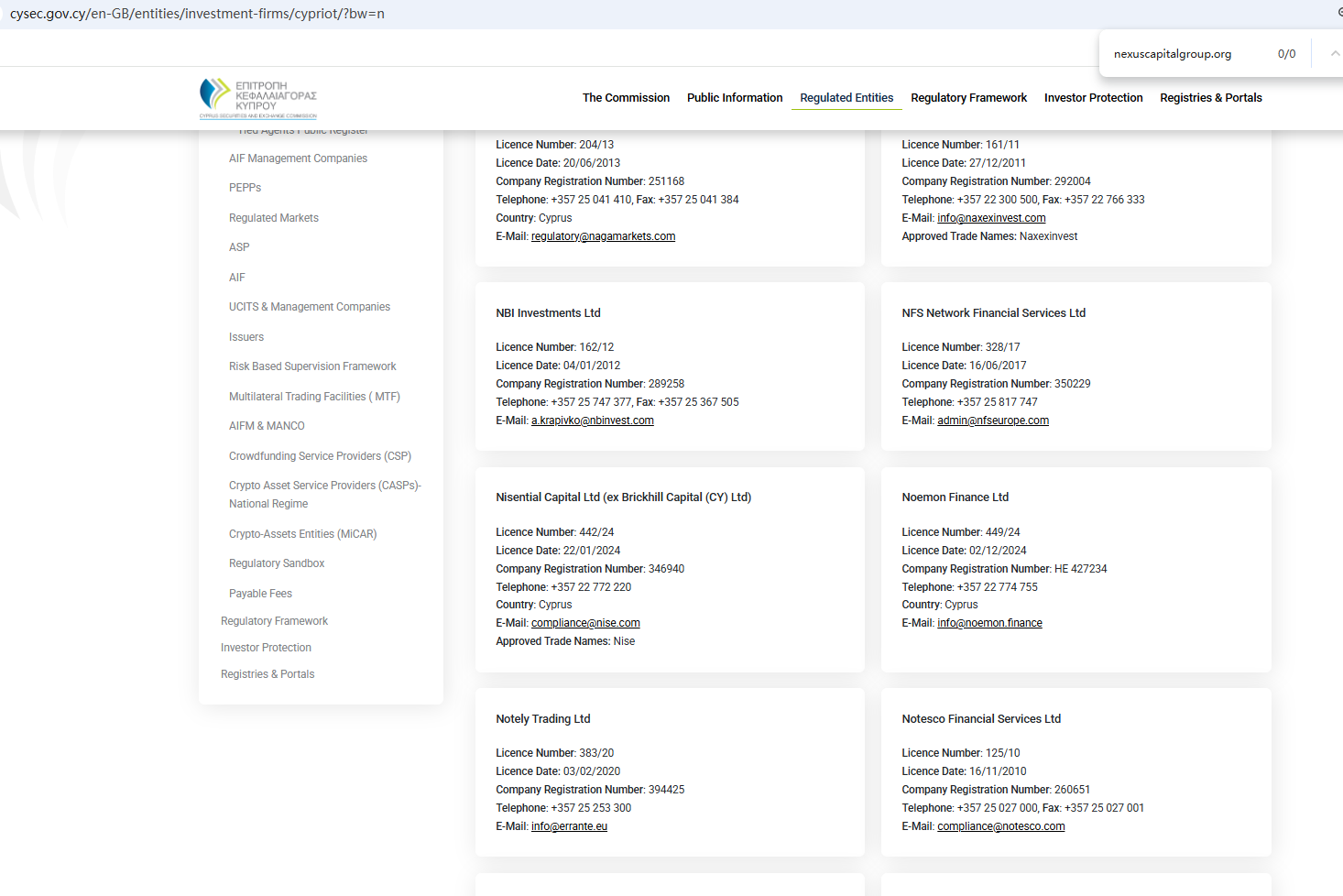 According to its website, it is regulated by both the Financial Conduct Authority (FCA) and the Cyprus Securities and Exchange Commission (CySEC). However, a search revealed no matching information with CySEC. Furthermore, the FCA issued a warning regarding nexuscapitalgroup.org, suspecting that this company may be offering financial services or products without the necessary authorization.