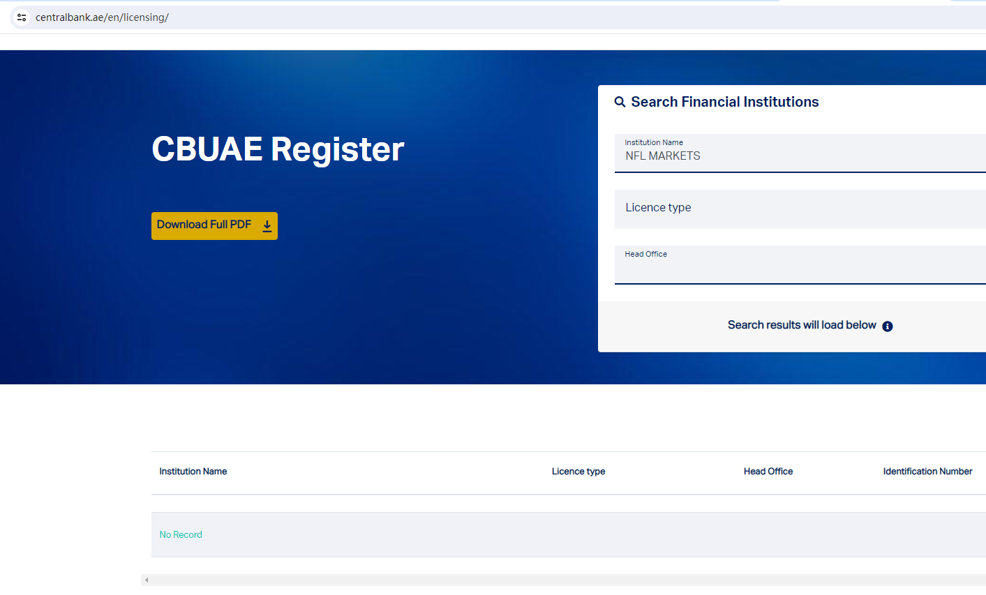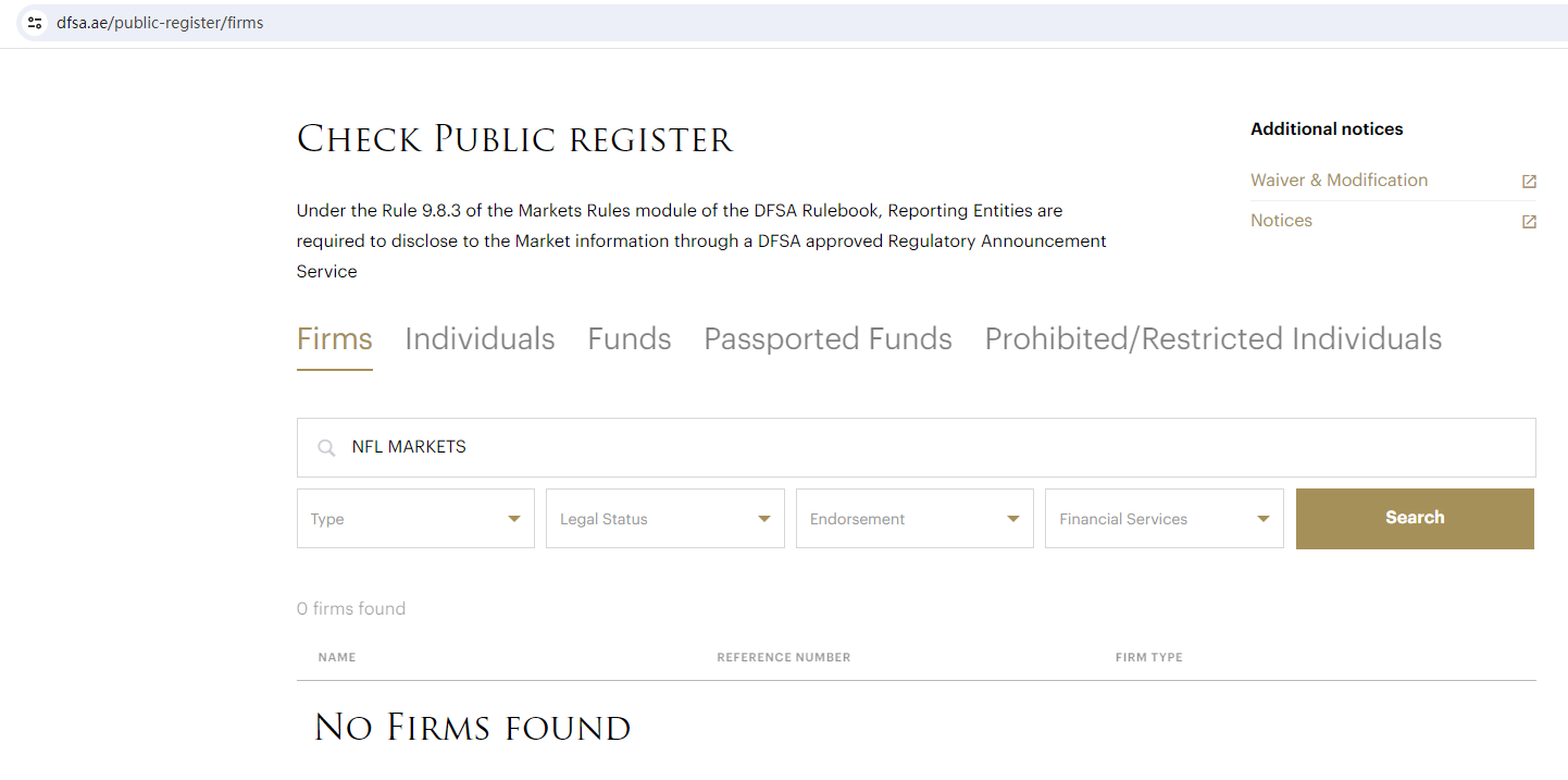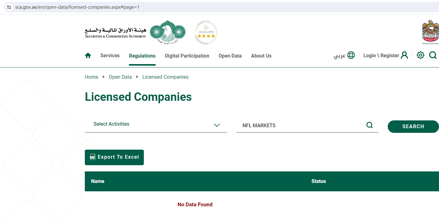 NFL MARKETS locates in the United Arab Emirates, we searched the DuBai Financial Services Authority (DFSA), the Securities and Commodities Authority (SCA) and the Central Bank of U.A.E. (CB U.A.E.) but found no matching results.