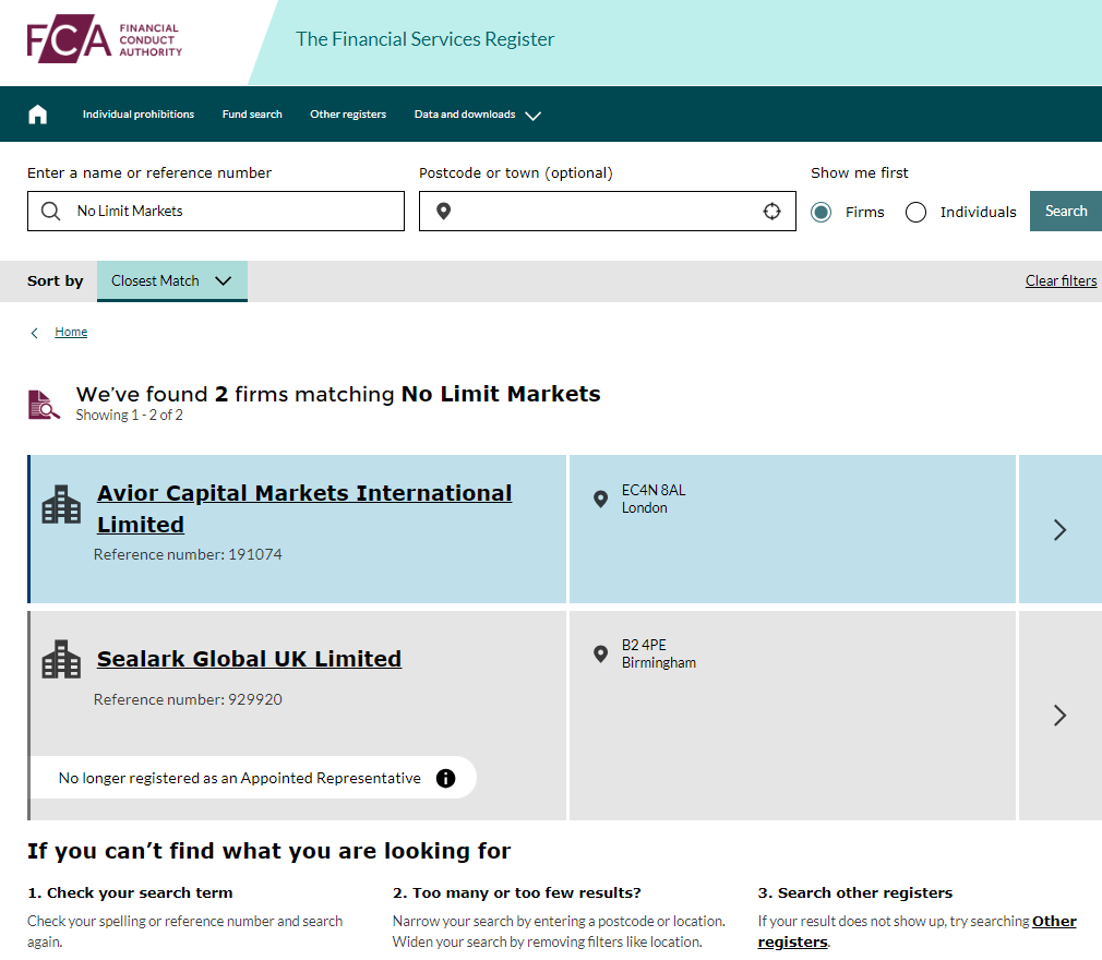 In addition, No Limit Markets is located in UK. Upon investigation, there is no matching information was found ine the Financial Conduct Authority (UK FCA).