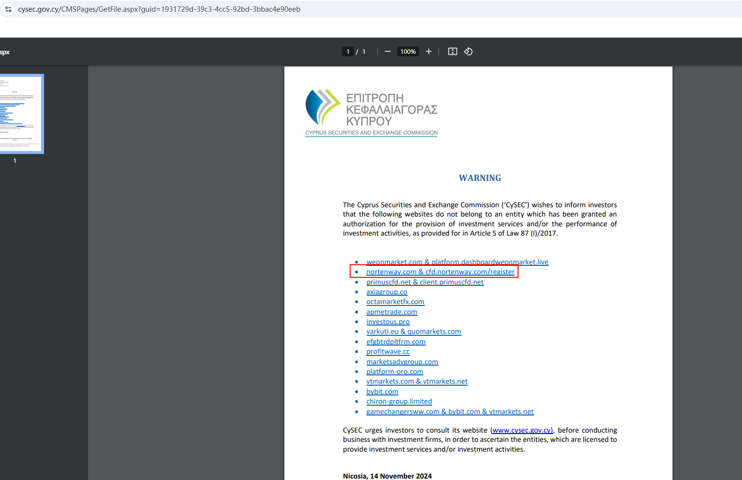 In addition, the Cyprus Securities and Exchange Commission (CySEC) added NortenWay to its warning list, stating it does not belong to an entity that has been granted authorization for the provision of investment services and the performance of investment activities.