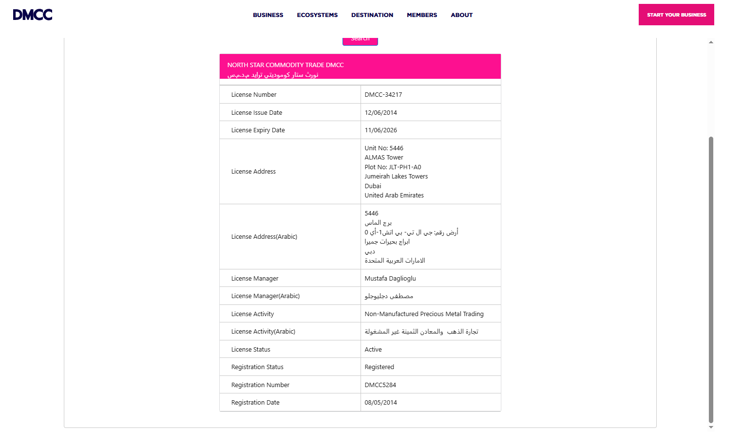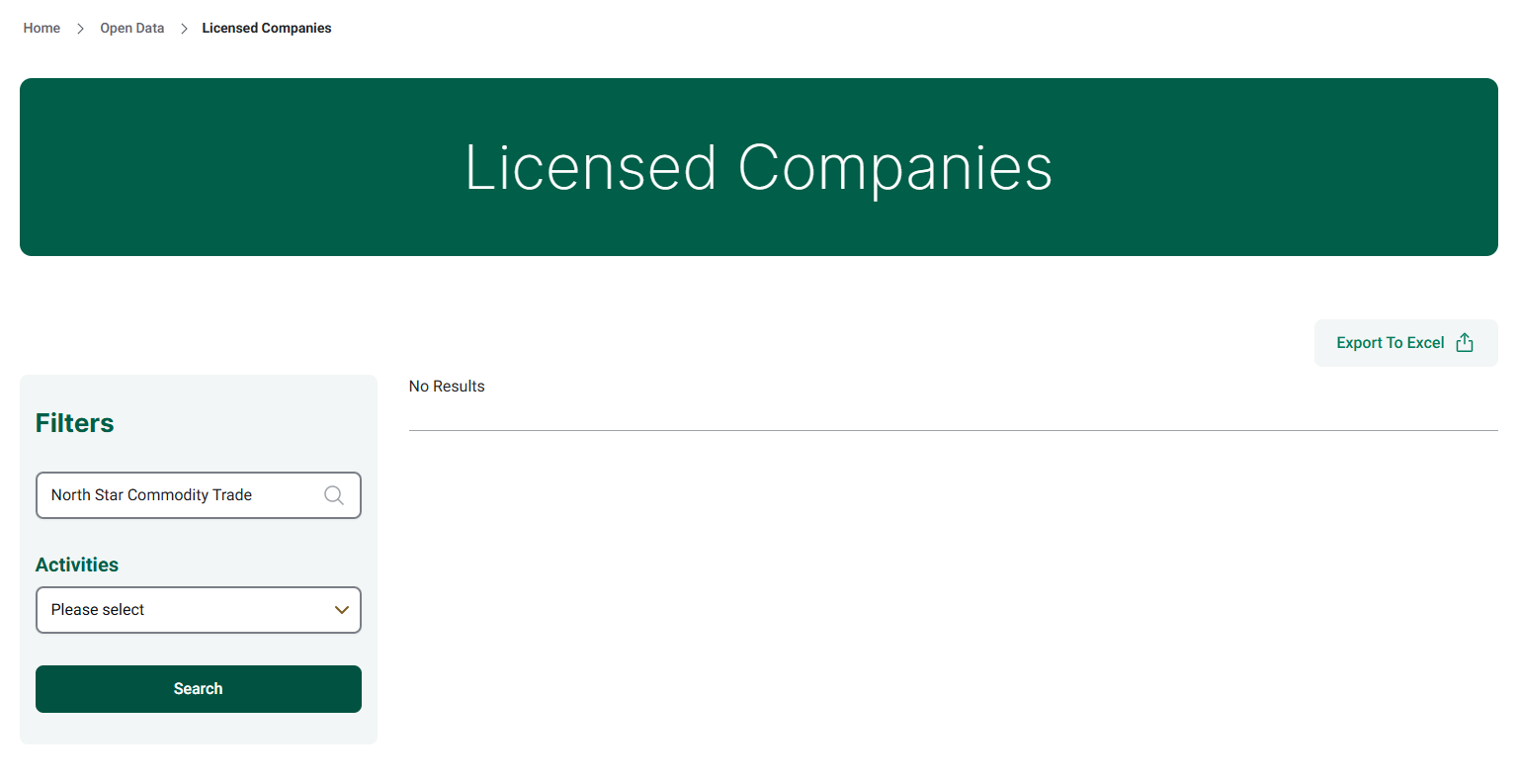 NorthStar claims to be based in the UAE and states that it holds a certificate issued by the Dubai Multi Commodities Centre (DMCC) under the entity name North Star Commodity Trade. While we can confirm the existence of this license, it is critical to understand that DMCC is not a financial regulatory authority and does not oversee or license forex trading activities. In the UAE, the proper regulator for forex and securities is the Securities and Commodities Authority (SCA), yet our search of the SCA’s official register yielded no record of NorthStar or any affiliated entity.