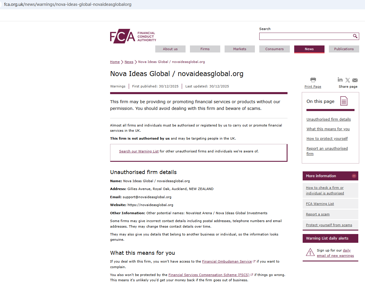 On Dec 30, 2025, the Financial Conduct Authority (FCA) issued a warning regarding Nova Ideas Global, suspecting that this company may be offering financial services or products without the necessary authorization. https://www.fca.org.uk/news/warnings/nova-ideas-global-novaideasglobalorg