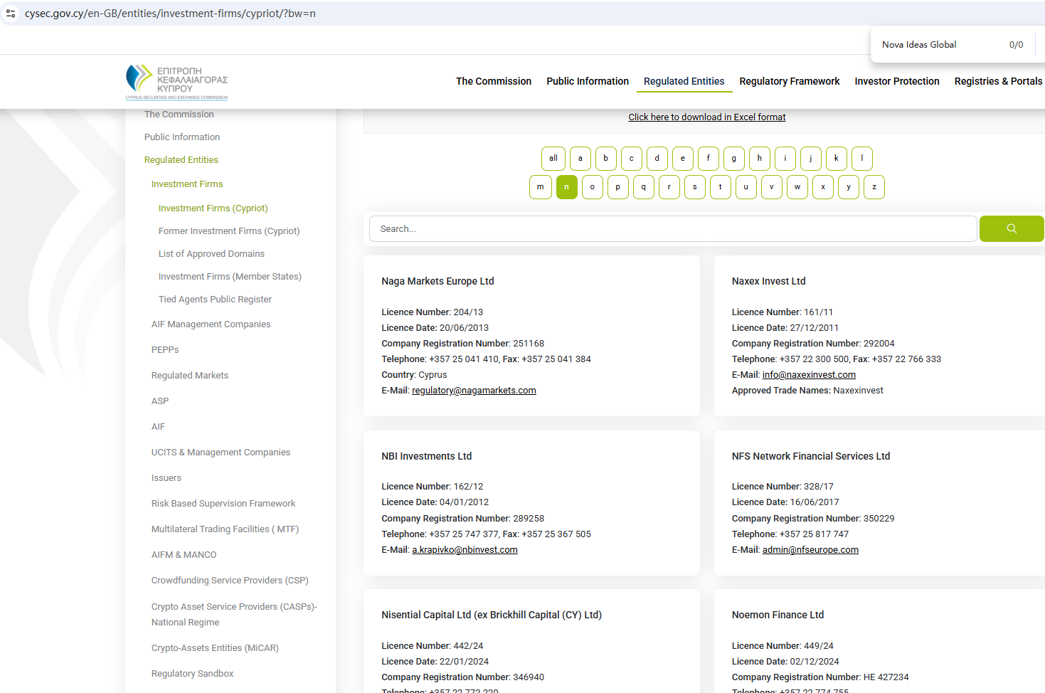 According to its website, it is regulated by both the Financial Conduct Authority (FCA) and the Cyprus Securities and Exchange Commission (CySEC). However, a search revealed no matching information with CySEC. Furthermore, the FCA issued a warning regarding Nova Ideas Global, suspecting that this company may be offering financial services or products without the necessary authorization.