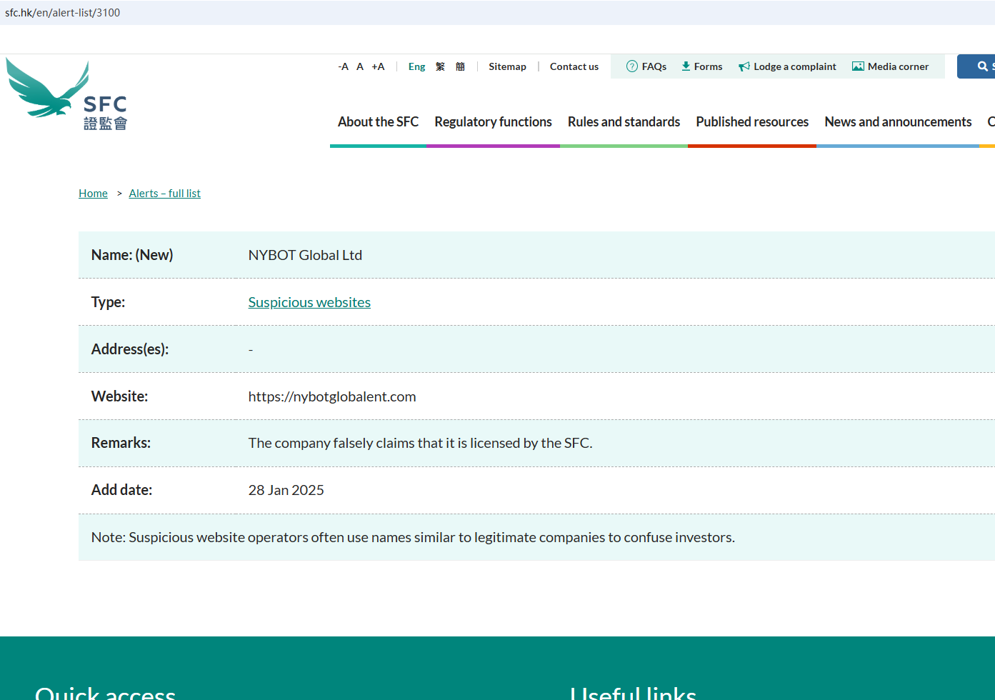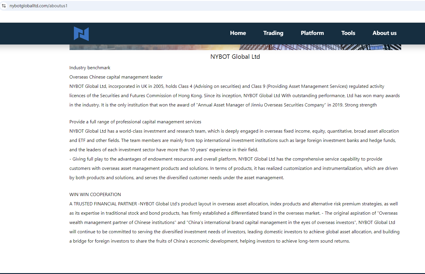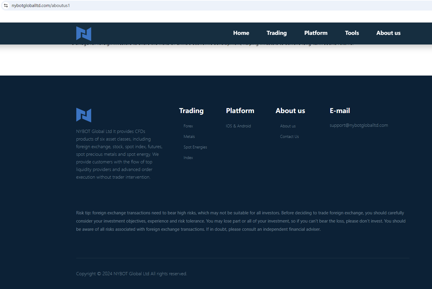 It claims to be established in the UK and regulated by Hong Kong. As we all know, if you want to exercise foreign exchange rights in the UK or Hong Kong, you must obtain the permission of the Financial Conduct Authority (FCA) and Securities and Futures Commission (SFC). Upon investigation, no matching information was found in the FCA and SFC.The truth is that NYBOT Global is not regulated by any regulators. Letting it hold or control investors' money is unsafe, and the money can not be protected by any laws.NYBOT Global is a scam.