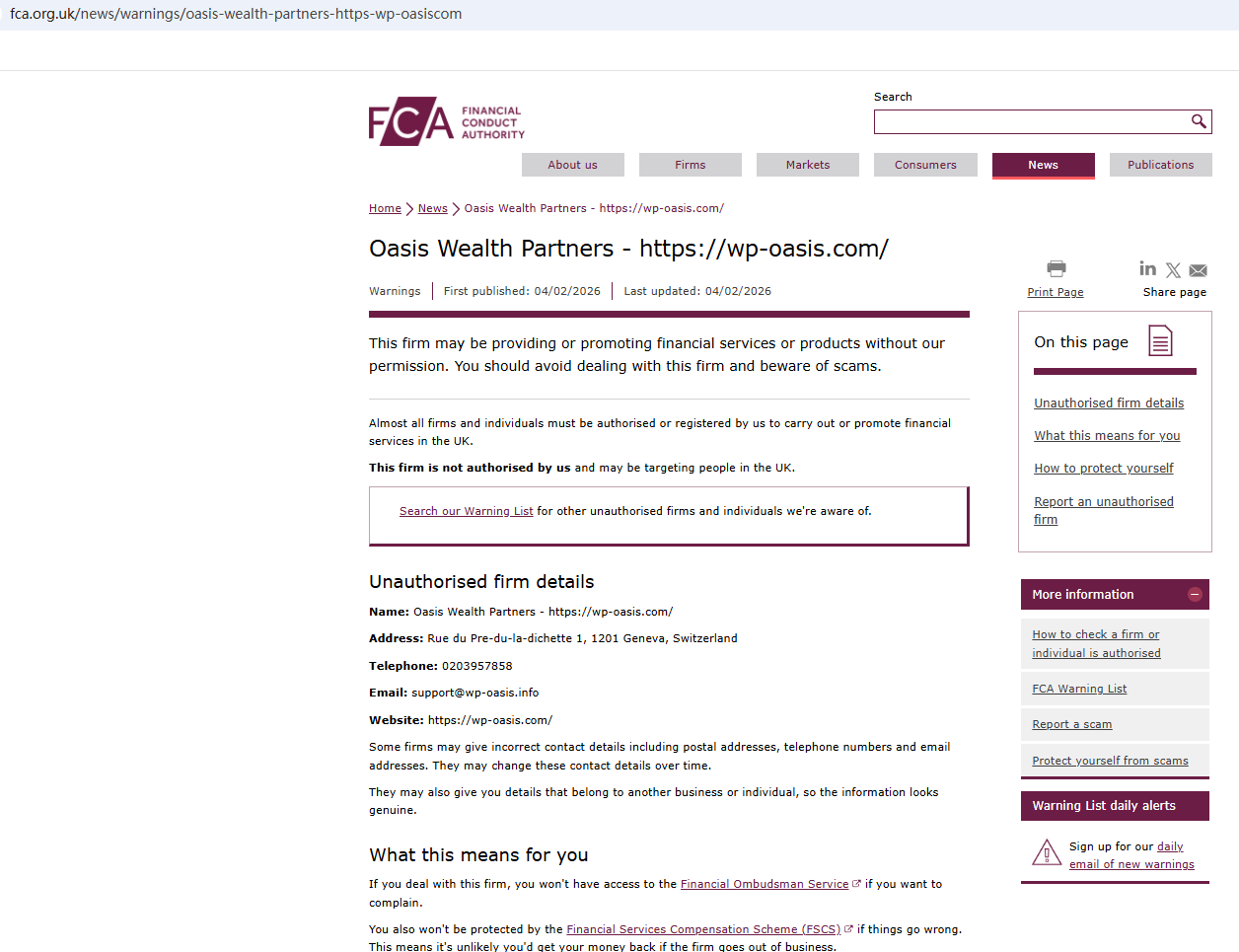 On Feb 4, 2026, the Financial Conduct Authority (FCA) issued a warning regarding Oasis Wealth Partners , suspecting that this company may be offering financial services or products without the necessary authorization. https://www.fca.org.uk/news/warnings/oasis-wealth-partners-https-wp-oasiscom