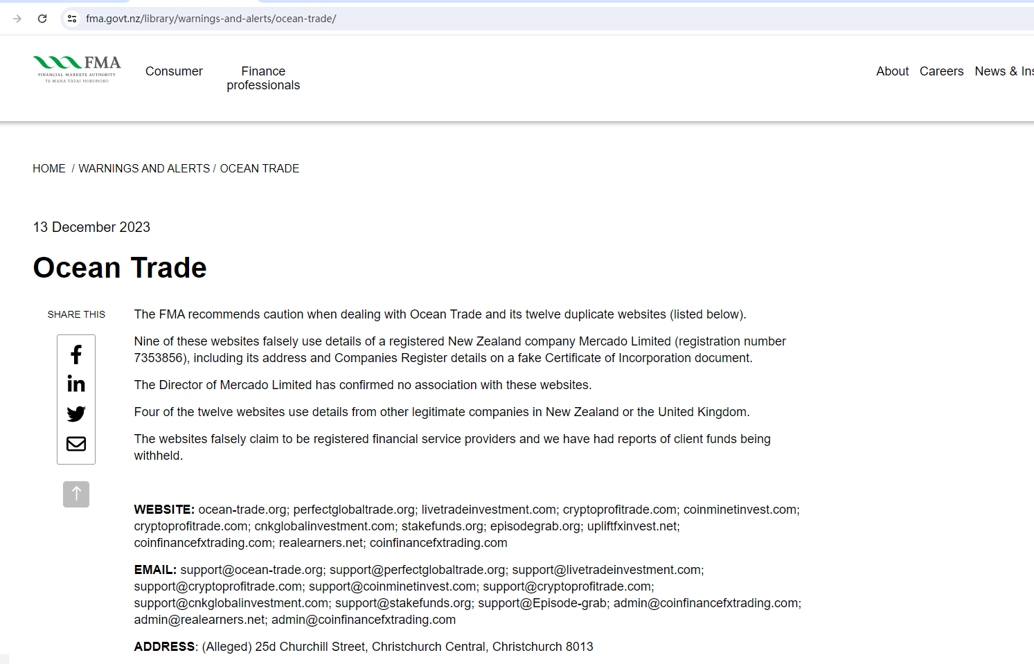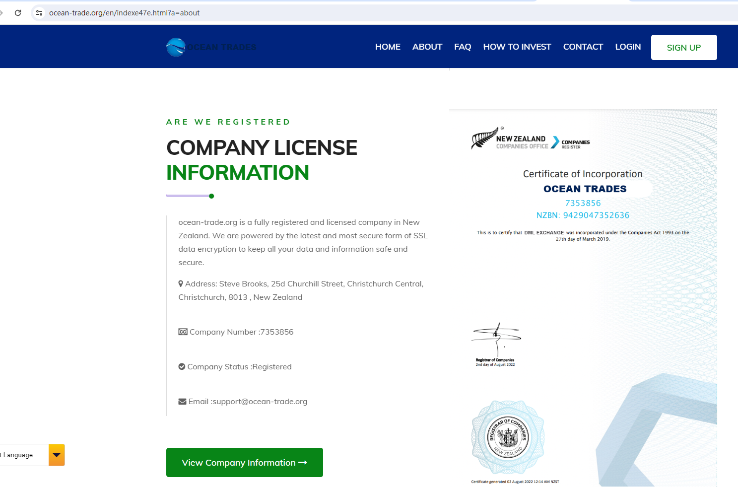 Ocean Trade claims to be a company registered and licensed in New Zealand, but the warning from the Financial Markets Authority (FMA) revealed otherwise. The FMA has confirmed that this fake trading platform misused information of a registered New Zealand company to appear legitimate, and the legitimate entity is definitely not associated with the bogus one.