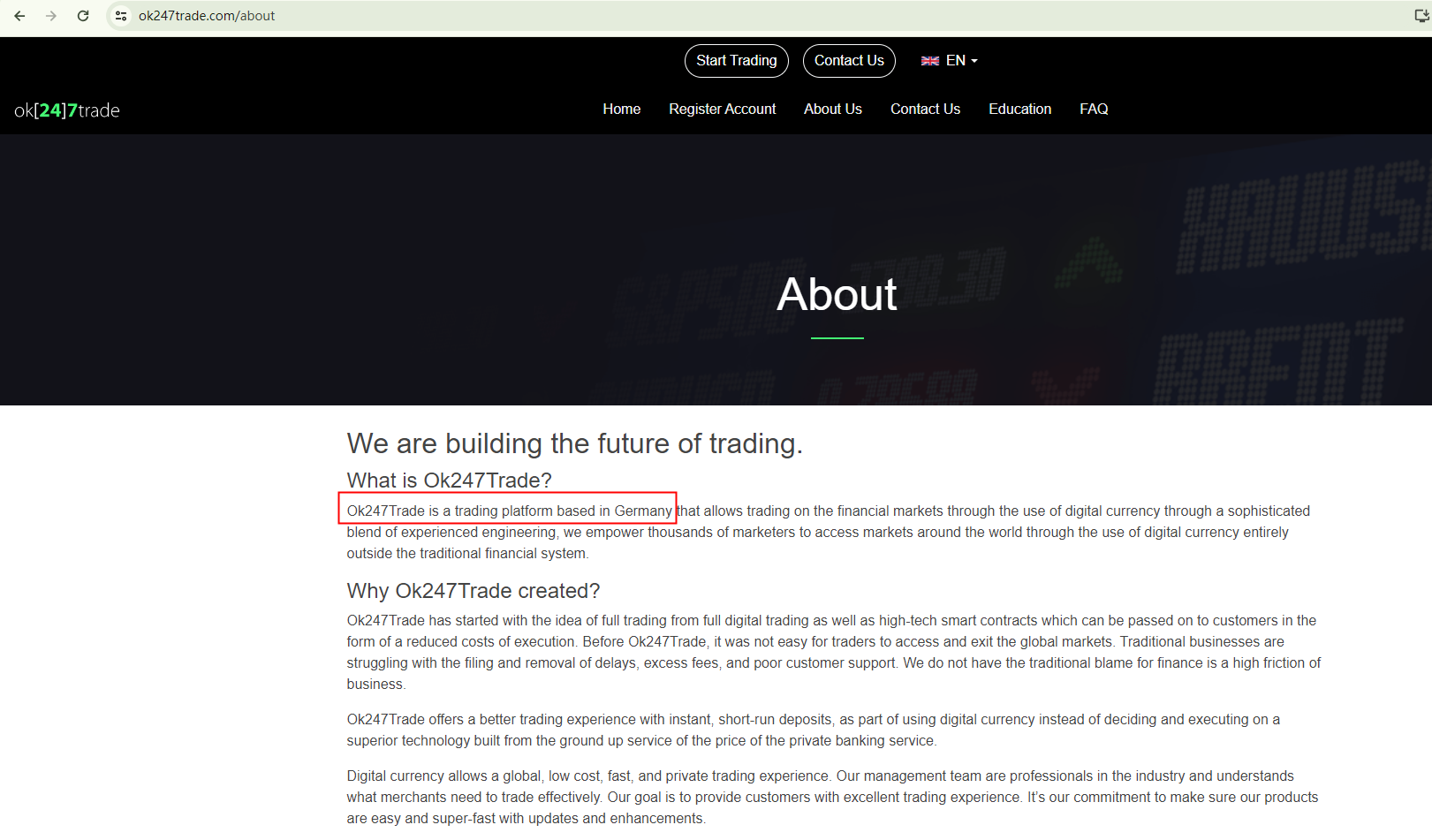 Ok247Trade purports to be based in Germany. However, there's no evidence to suggest that it's registered with the country's financial regulator, the Federal Financial Supervisory Authority (BaFin).
